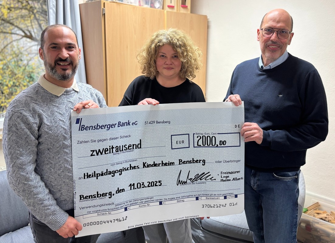 So konnten Herr Burak Elbi, Vorsitzender der Freimaurerloge Matteo Alberti e.V., und Herr Walter Füllhardt, Schatzmeister der Freimaurerloge Matteo Alberti e.V., insgesamt 2.000 Euro stellvertretend an Frau Katy Werner, Leiterin des Heilpädagogischen Kinderheims in Bensberg, am 11. März 2025 übergeben werden.