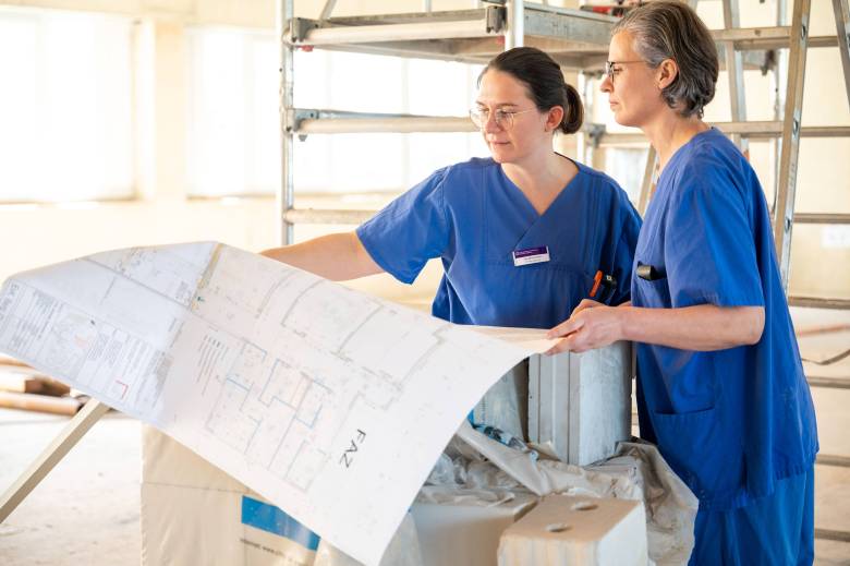 Lisa Wiechmann (links, Leitung OP-Management) und Angelina Wall (OP-Leitung) betrachten im Rohbau des künftigen OPs die Baupläne. Foto: Daniel Beer