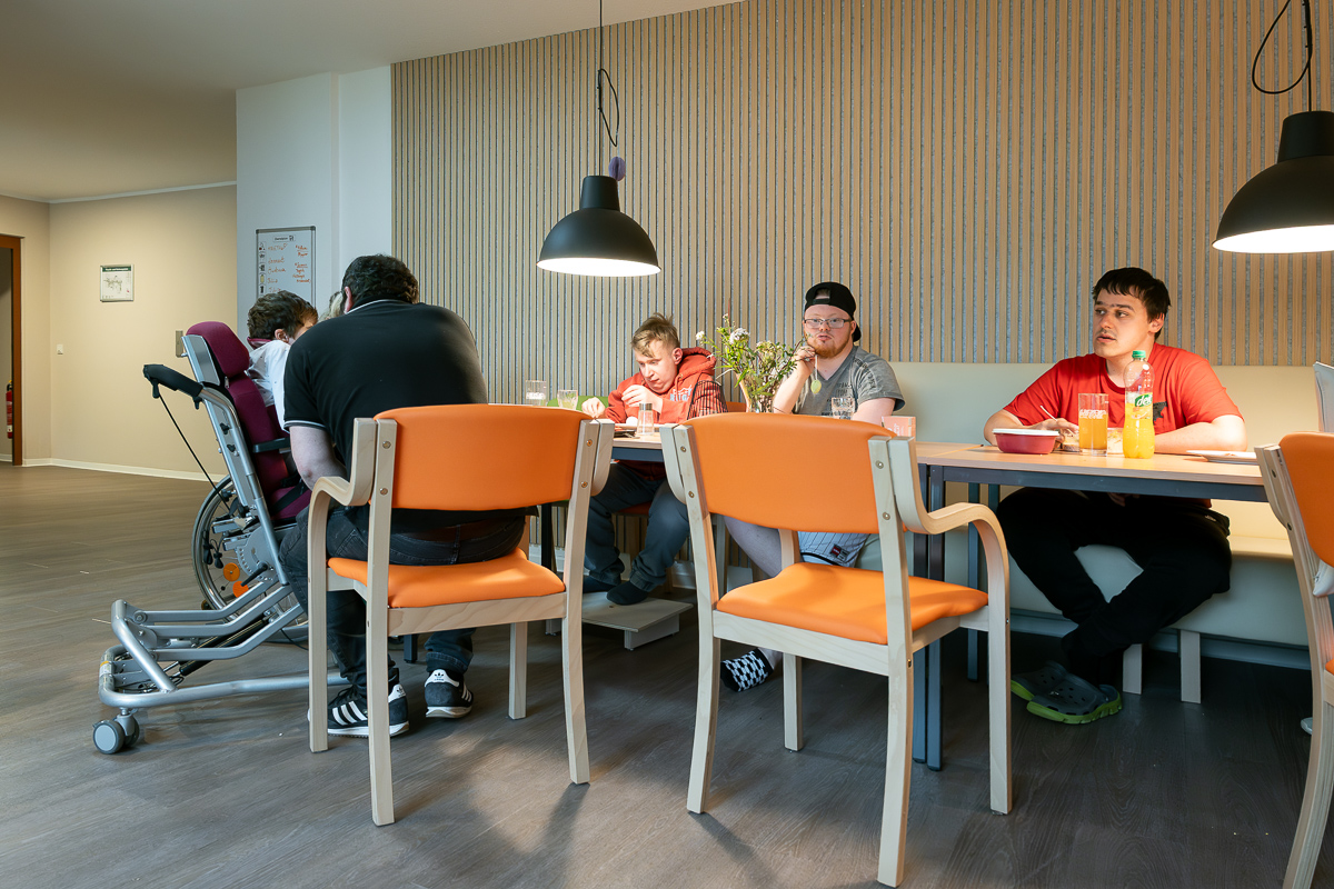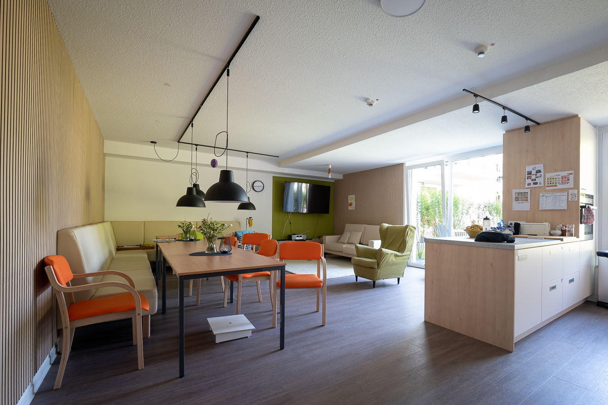Zentrum der Wohngemeinschaft ist ein großer Wohn-Ess-Raum mit Küche, gemütlichen Sesseln Sofa und Fernseher und angrenzender Terrasse. Hier treffen sich die Frauen und Männer zu den Mahlzeiten und verbringen gemeinsame Zeit, wenn sie aus ihren Werkstätten kommen.