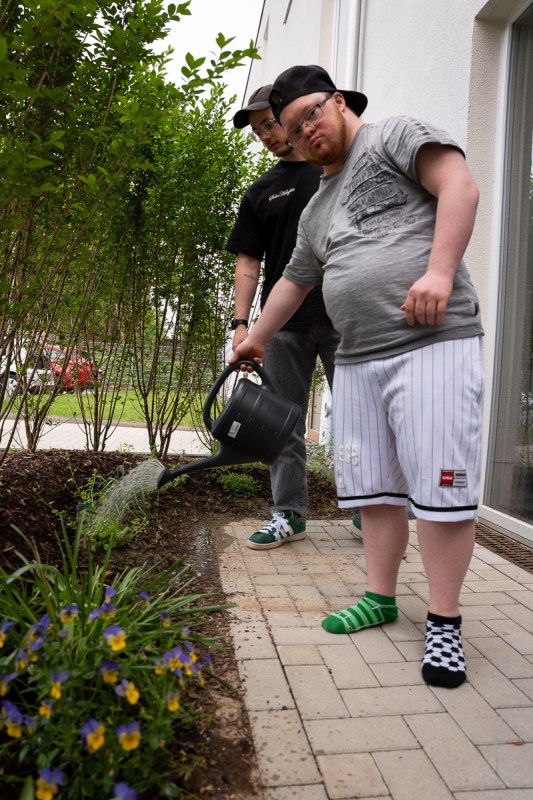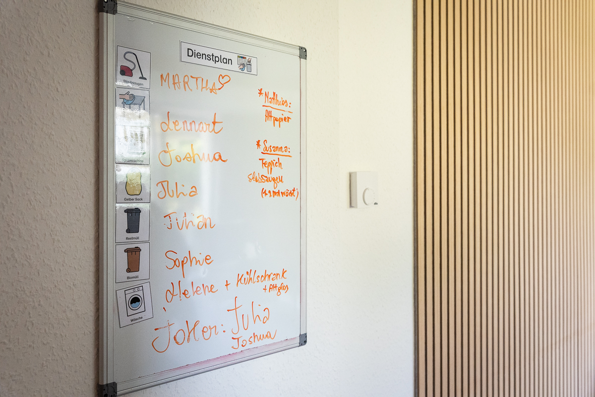 Auch in der Wohngruppe haben die Bewohner:innen bestimmte Aufgaben, die in einem Dienstplan im Gemeinschaftsraum festgehalten werden – Müll rausbringen, Tisch abwischen oder den Kühlschrank säubern zum Beispiel. Nicht alle können alles. „Die fitteren helfen denen, die nicht so fit sind“, berichtet Michael Berzbach. Helene etwa wasche die Wäsche für seine Tochter Sophie mit.