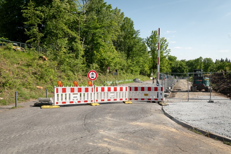 Die Zufahrt ist nicht für Anlieger frei, sondern lediglich für Berechtigte. Und das sind nur solche KfZ, die von der Stadt ein Sondernutzungsrecht erhalten haben. Besucher:innen gehören in aller Regel nicht dazu. Das galt bislang, für die Zufahrt über die Brücke. Und erst recht jetzt, denn die aktuelle Zufahrt ist ein schmaler Waldweg, der über eine längere Strecke durch ein Naturschutzgebiet führt.