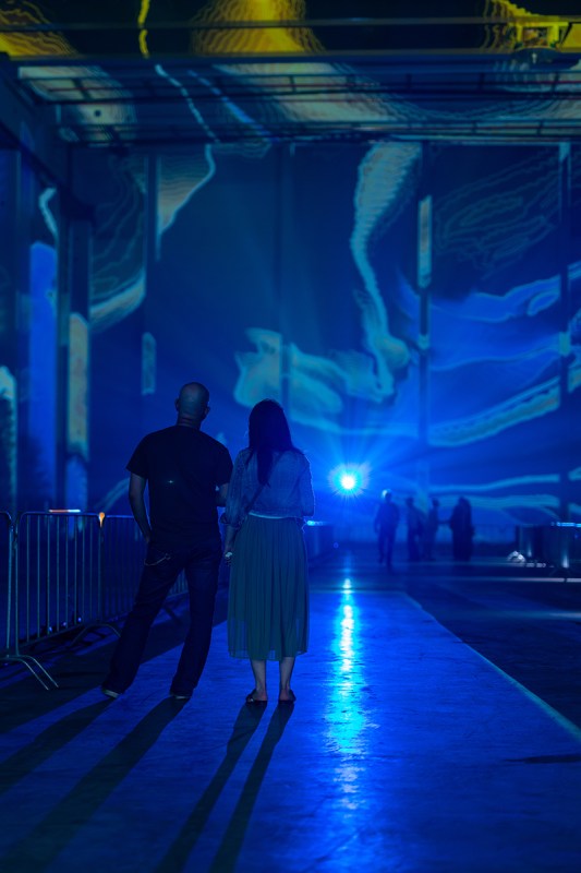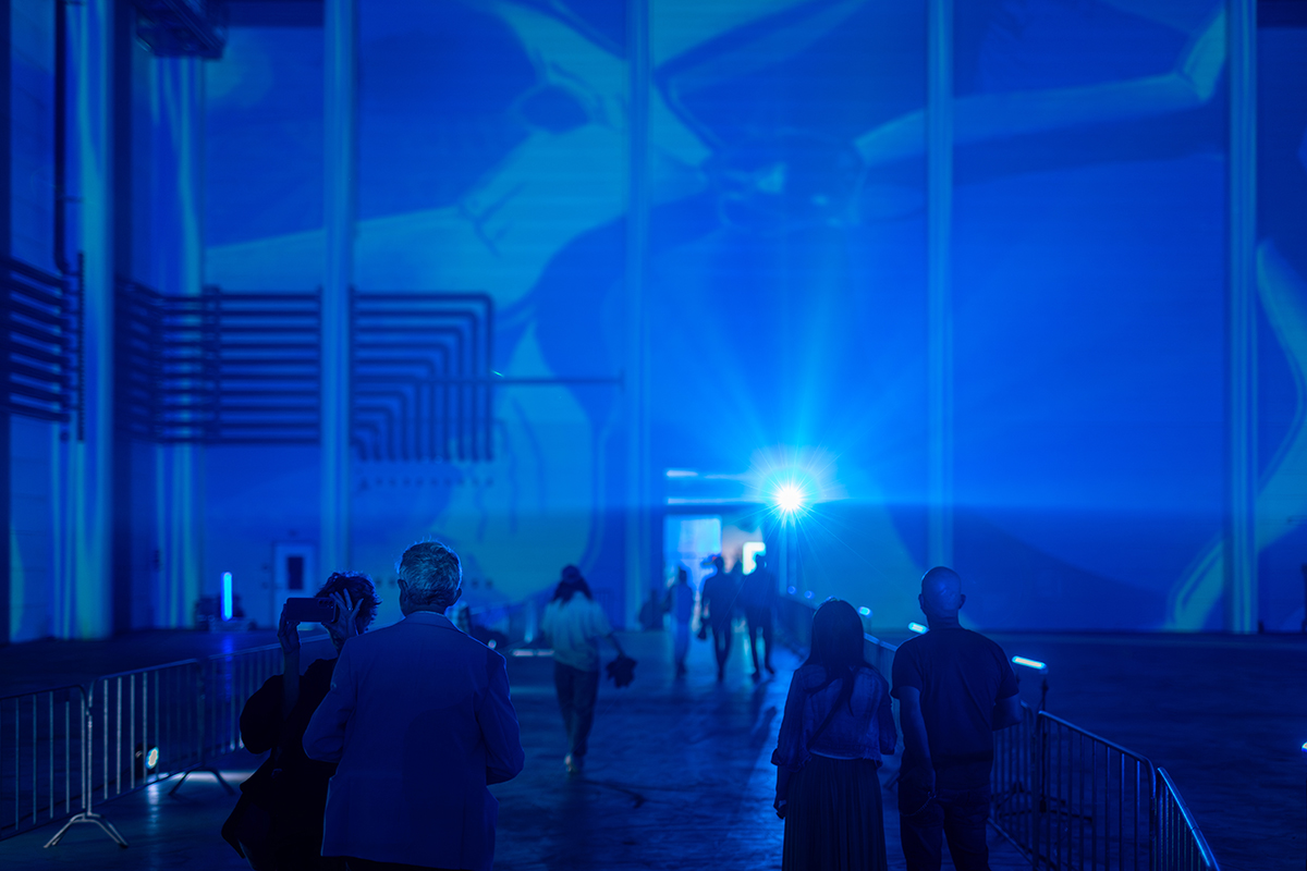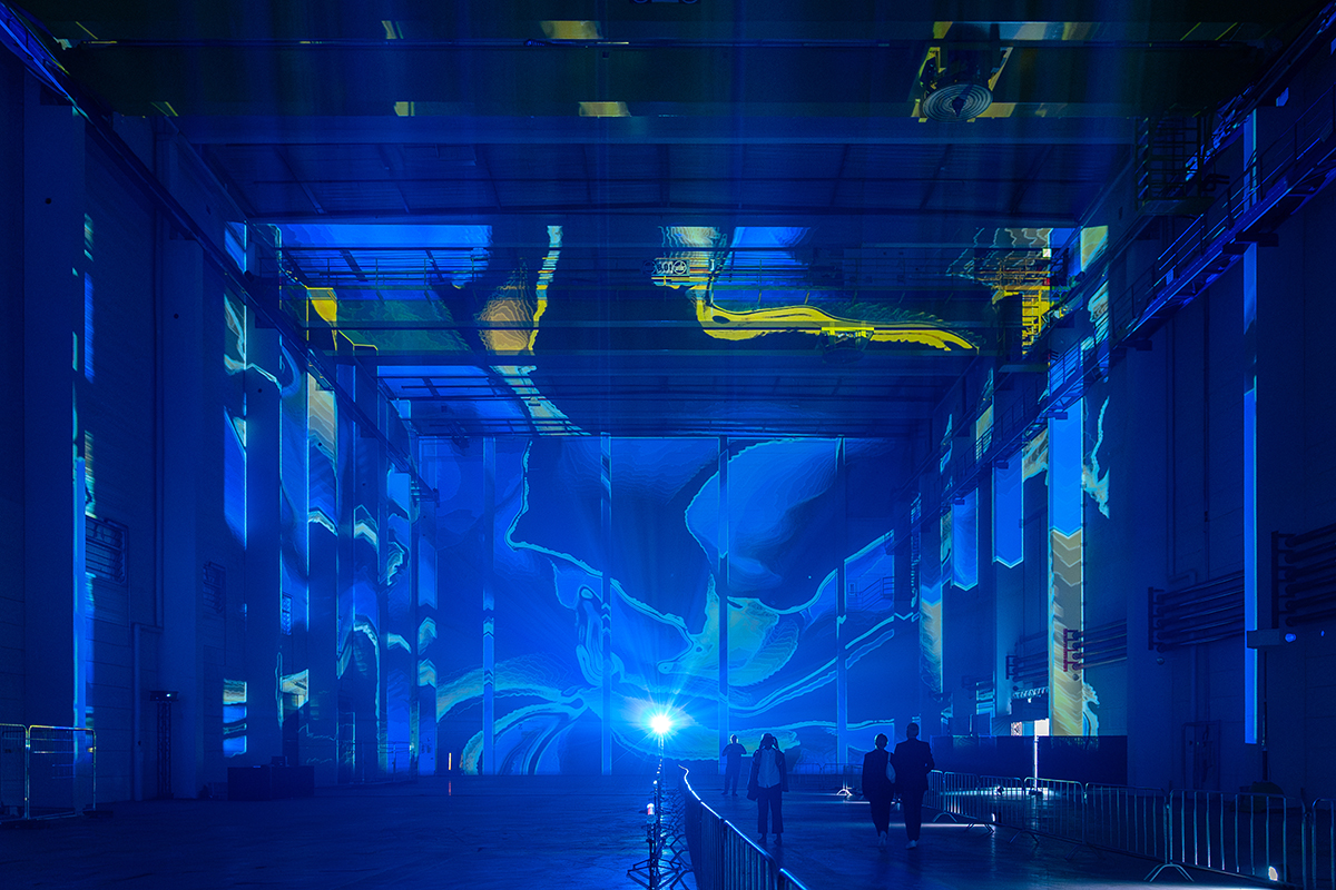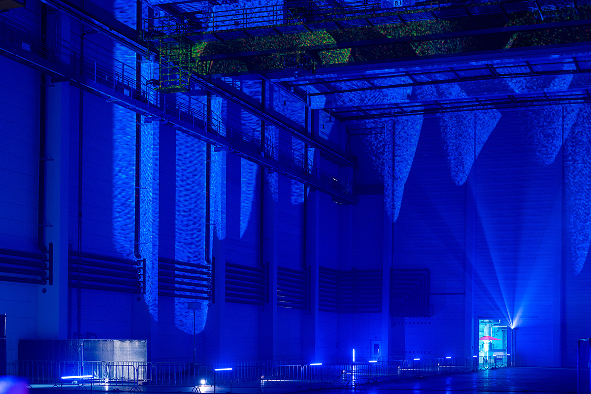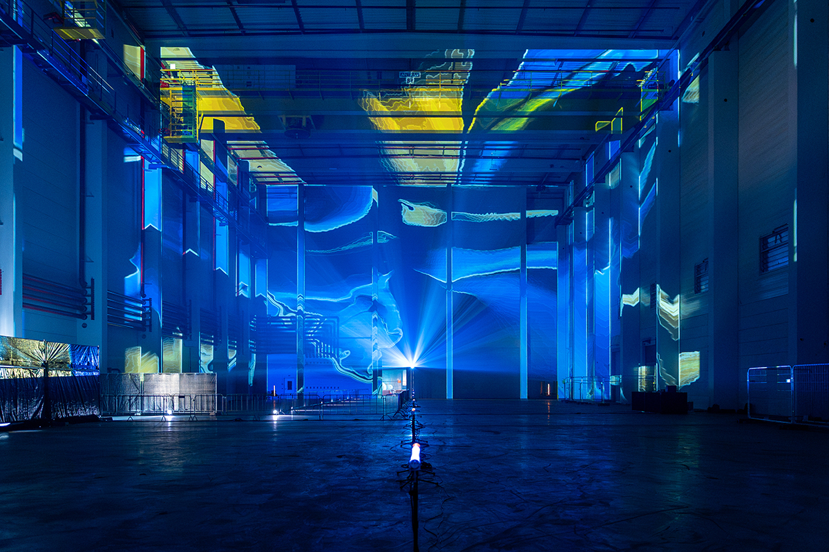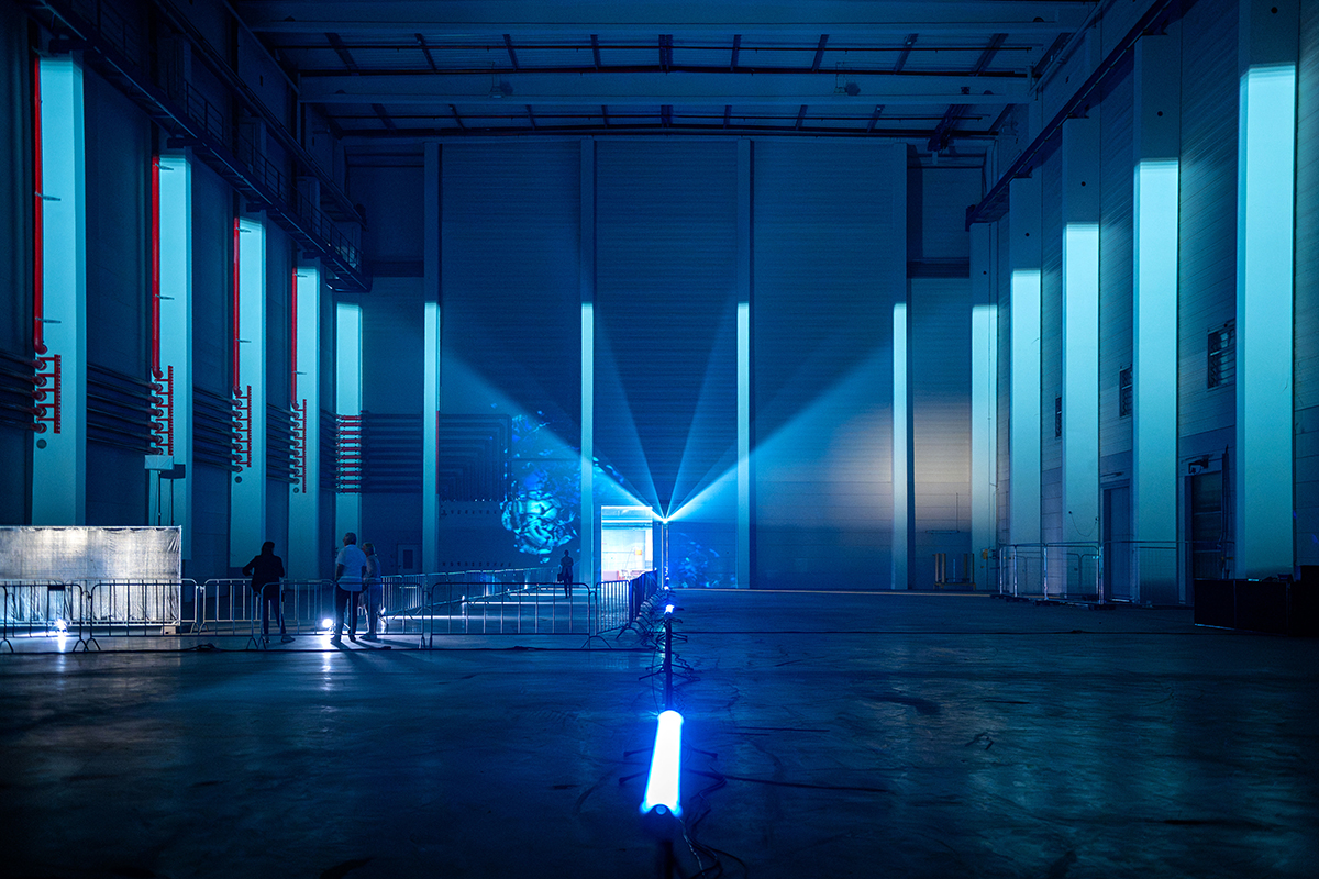 Die Installation in der Halle bestand dann aus drei großflächigen Projektionen und 16 LED-Tubes sowie eigens generierten Echzeit-Visuals, die in wiederkehrenden Loops die Halle zu einer großen Leinwand machten.
