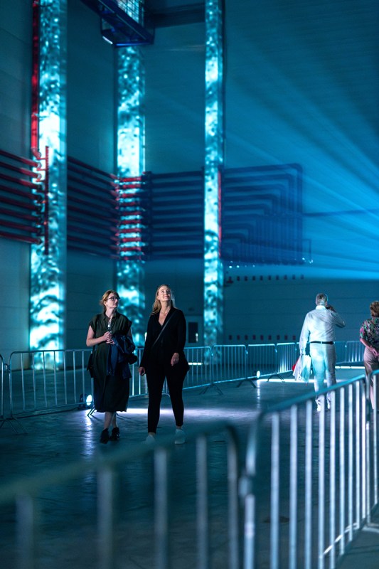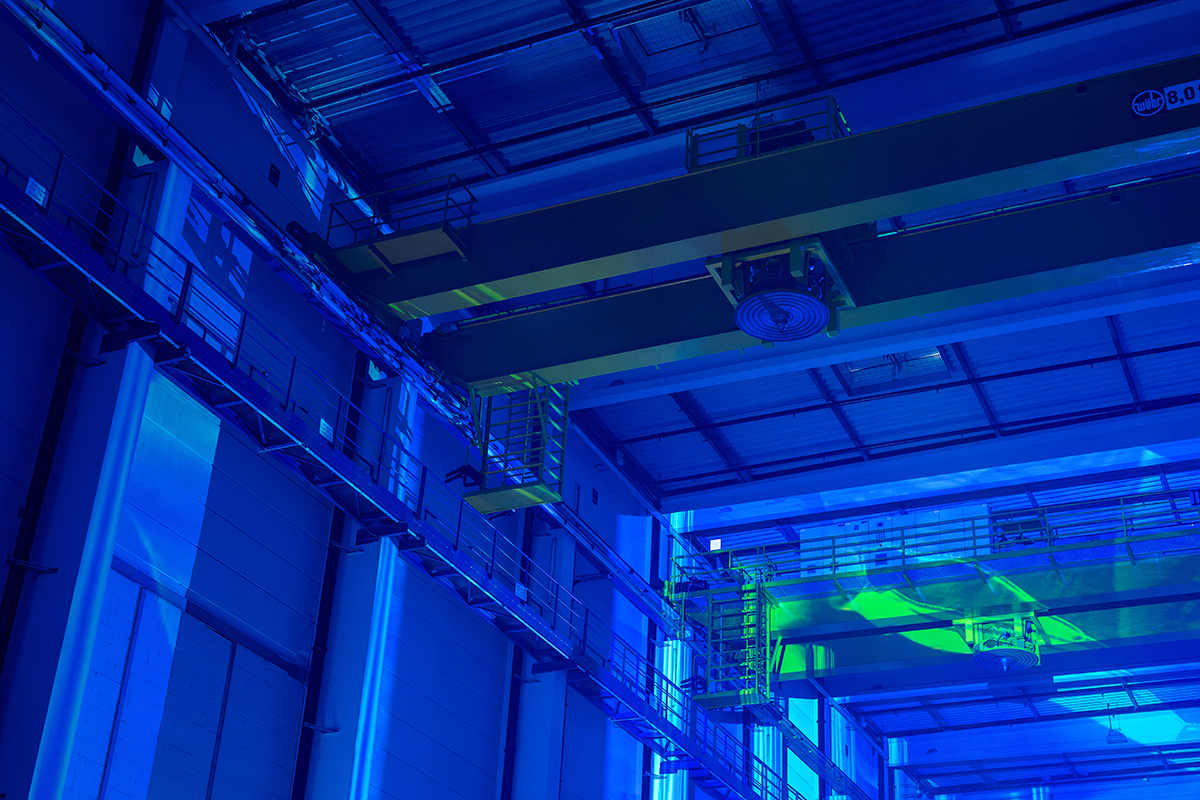 Dort, wo früher Tonnen von Papierrollen gelagert wurden, ist für nur wenige Tage ein Ort für Kunst, Erinnerung und Zukunftsvisionen entstanden. Mit ihrer Konzeption haben die Künstler:innen Ruben Tsangaris, Anna Balthasar und Max Schweder bewusst an der Industriegeschichte des Ortes angesetzt: Licht, Projektionen und abstrakte Formen machten die besondere Architektur der gigantischen Halle auf dem Zanders-Areal neu erfahrbar und stellen einen Bezug zwischen Vergangenheit und Gegenwart her.