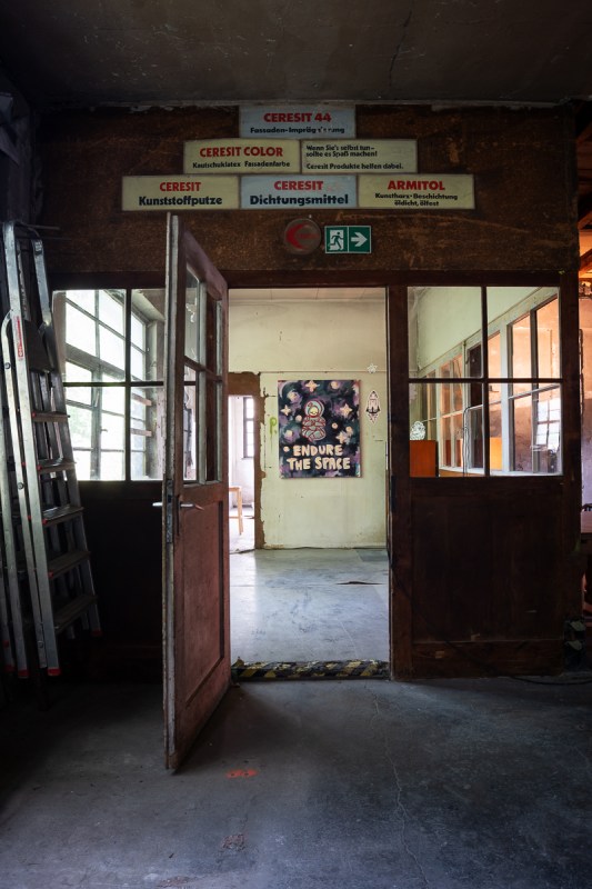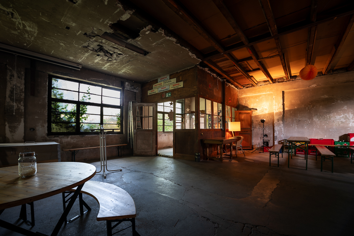 Ein Schwebezustand. Die Fenster geben den Blick in die Partyzone der Lux-Hallen frei. Man sieht noch die Reste des alten Betriebs, aber da stehen auch Bierbänke und Tische.