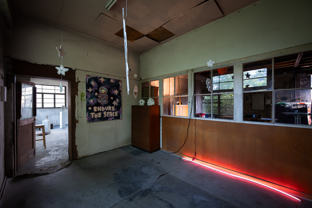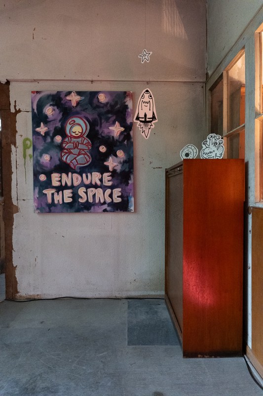 Apropos Sterne – Michael Lux und Nils Peter teilen die Begeisterung für Science Fiction. Lux eher als Lektüre, Peter eher als Fan der TV-Serie Star Wars. Im kleinsten Raum, einer Art Glaskasten, kommt die Ausstellung ganz zu sich. Auf dem einzigen Gemälde schwebt ein Astronaut im Lotussitz. „Endure Space“ steht darunter: Ertrage den Raum. Augäpfel, Sterne, Raketen, Außerirdische und Explosionen, mit kräftiger Linie auf kleine, weiß lackierte Objekte gezeichnet, baumeln von der Decke.
