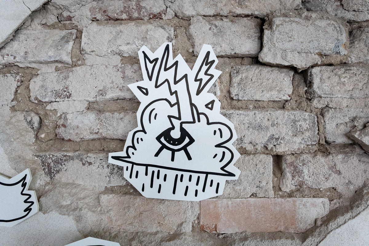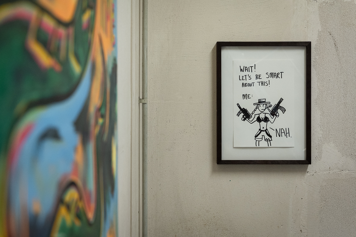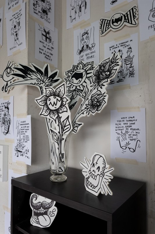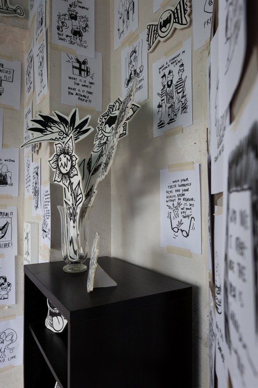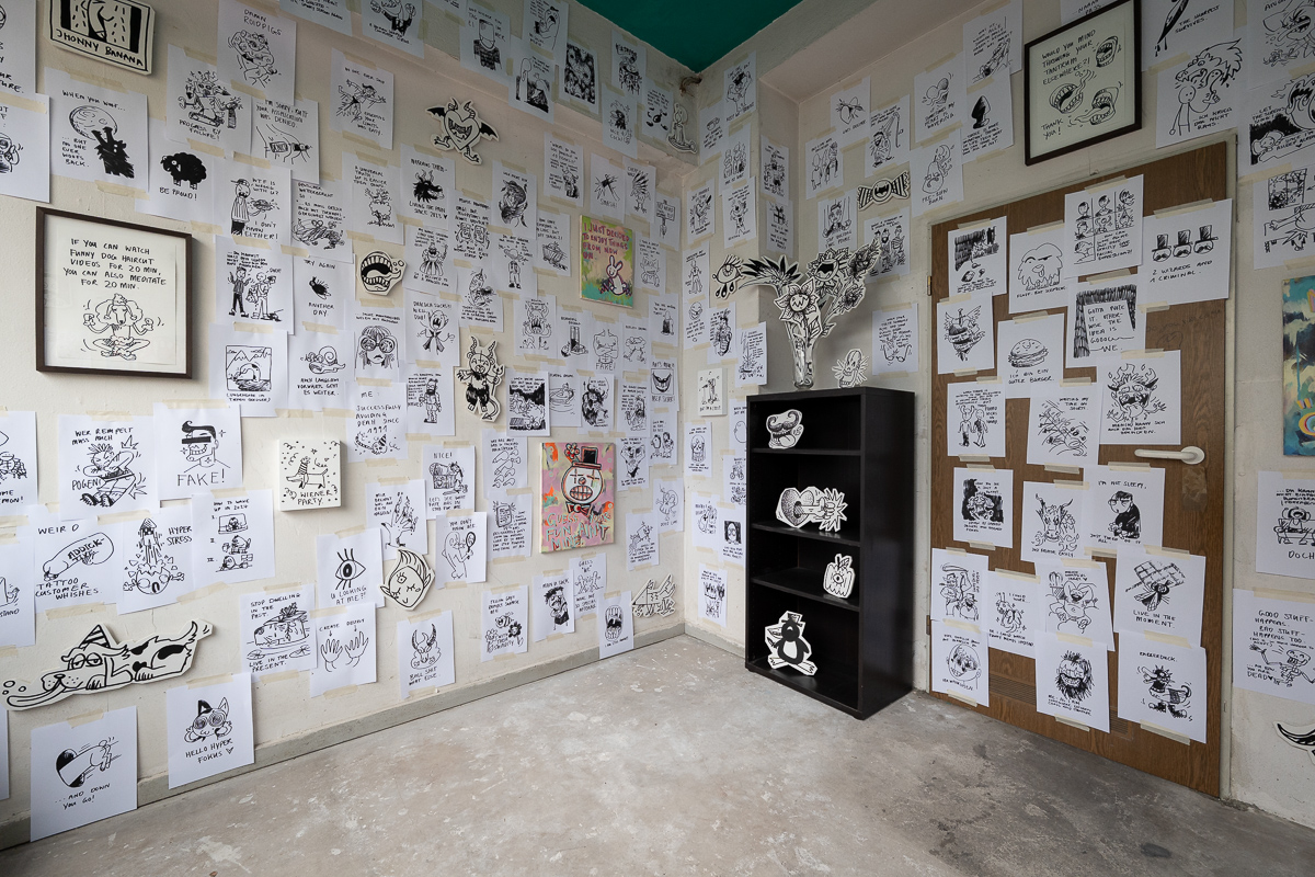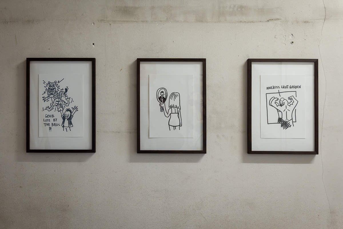 Das nächste Fenster erlaubt den Blick in die Ausstellung „Enjoy“ des Kölner Künstlers und Tätowierers Nils Peter. Schwarz-Weiß-Zeichnungen, versehen mit Schrift und kleine Objekte füllen die Wände. Die Zeichnung eines Hundes in Clownskostüm und Yoga-Pose zieht meinen Blick auf sich. „Lieber 20 Minuten meditieren als Hundevideos anschauen“, lese ich durchs Fenster.