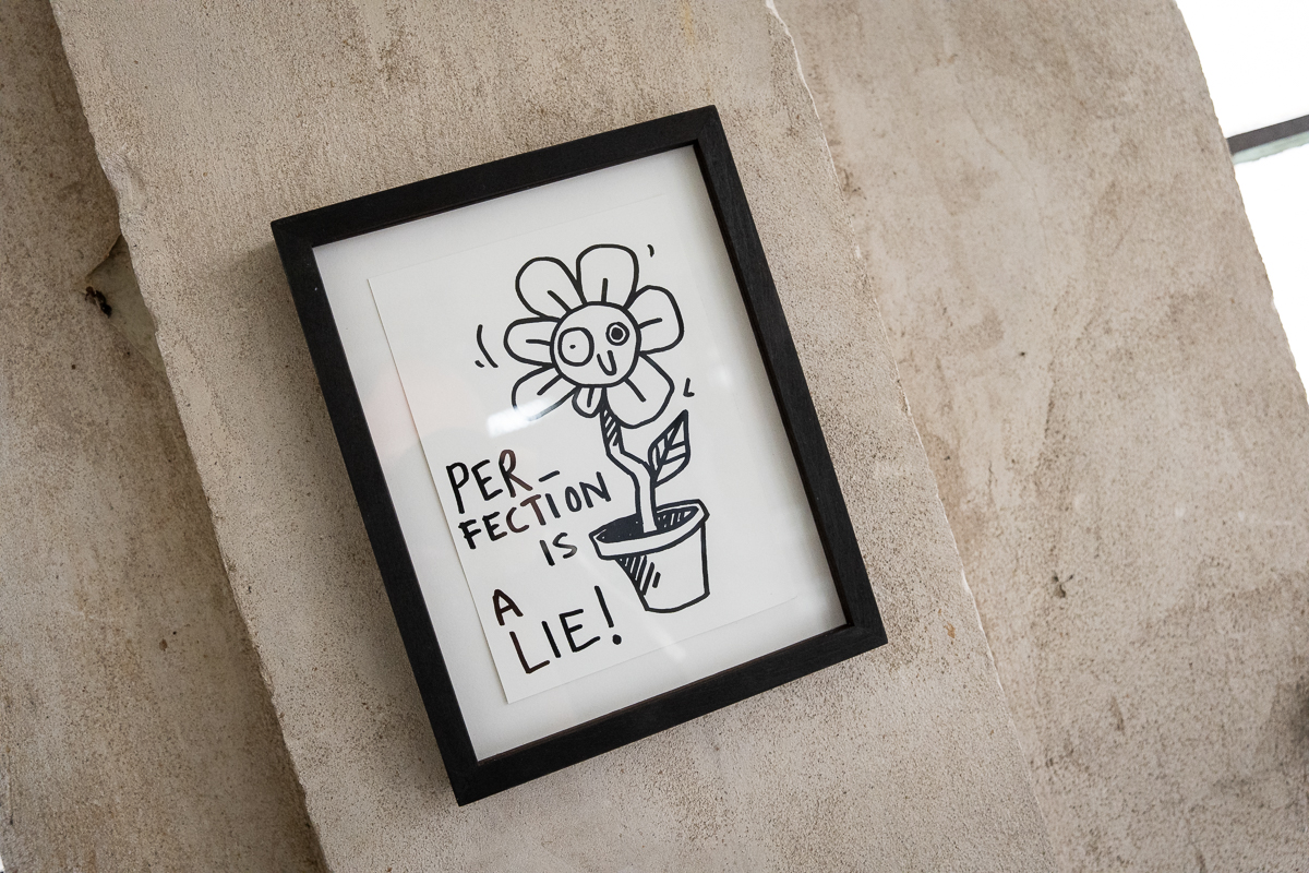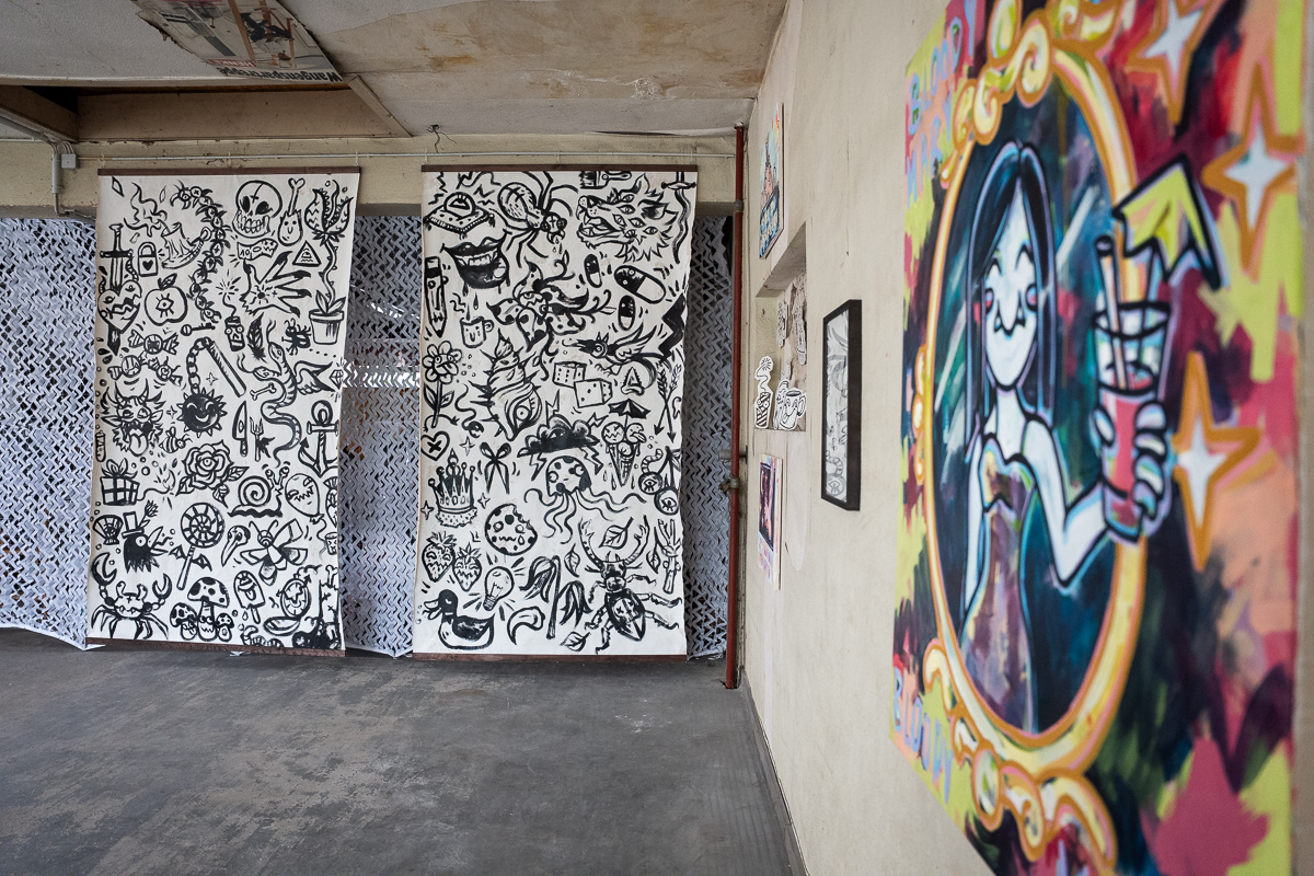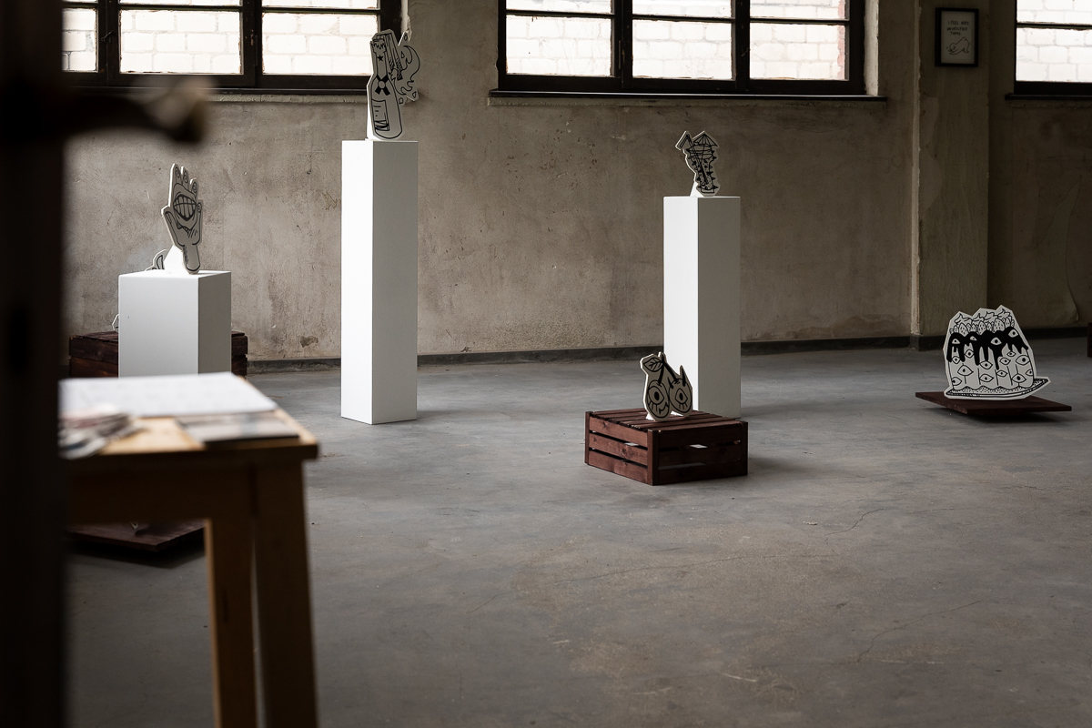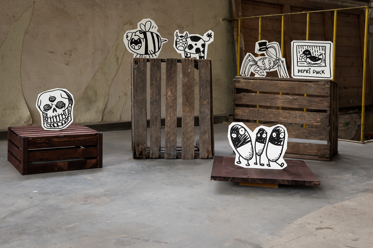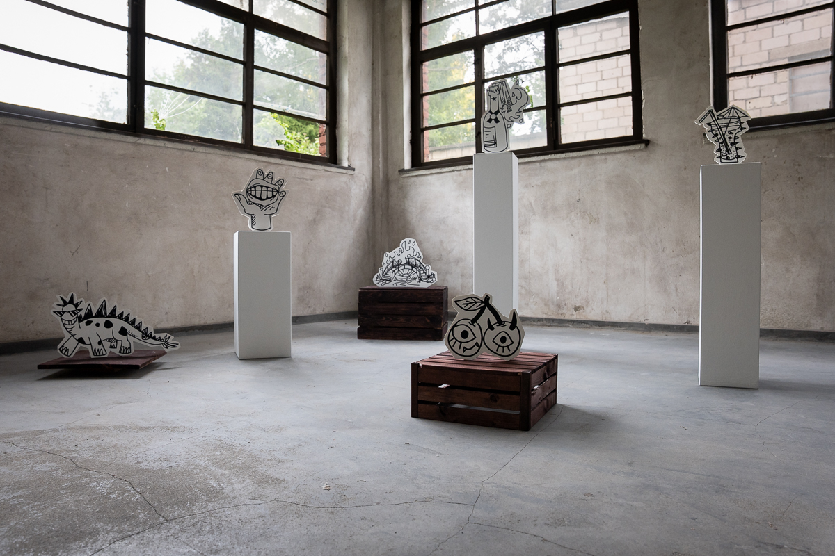 Das nächste Fenster erlaubt den Blick in die Ausstellung „Enjoy“ des Kölner Künstlers und Tätowierers Nils Peter. Schwarz-Weiß-Zeichnungen, versehen mit Schrift und kleine Objekte füllen die Wände. Die Zeichnung eines Hundes in Clownskostüm und Yoga-Pose zieht meinen Blick auf sich. „Lieber 20 Minuten meditieren als Hundevideos anschauen“, lese ich durchs Fenster.