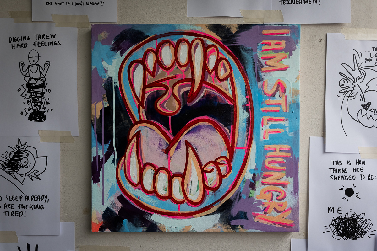 Tatsächlich: Sobald ich die Brille aufsetze, scheint es förmlich zu vibrieren, wirkt deutlich dreidimensional, die Farben nehmen einen metallischen Glanz an. Wie entsteht der Effekt? Peter erklärt, dass er die Umrisslinien der Figuren und Wörter mehrmals übereinander auf die Leinwand aufträgt, aber stets leicht versetzt. Wichtig dabei: sowohl warme als auch kalte Farben zu verwenden.