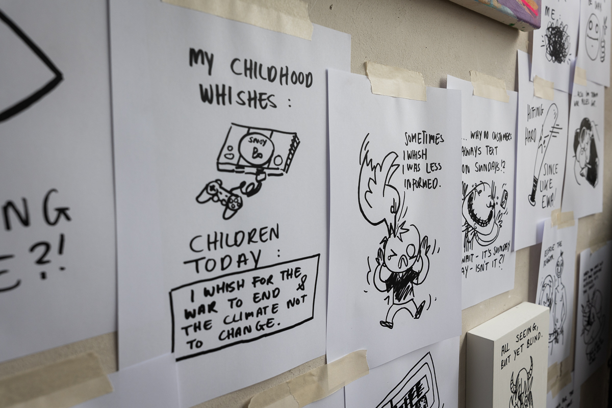 Im zweiten Schritt verdichtet Nils Peter seine Notizen und Skizzen zu Zeichnungen mit zumeist figurativen Formen (Personen, Tiere, Symbole) und einem kurzen Statement. Ich denke an die US-Künstlerin Jenny Holzer mit ihren Leuchtschriftbändern und an den britischen Künstler David Shrigley mit seinen comicartigen Zeichnungen, die voller Selbstzweifel und Humor stecken.