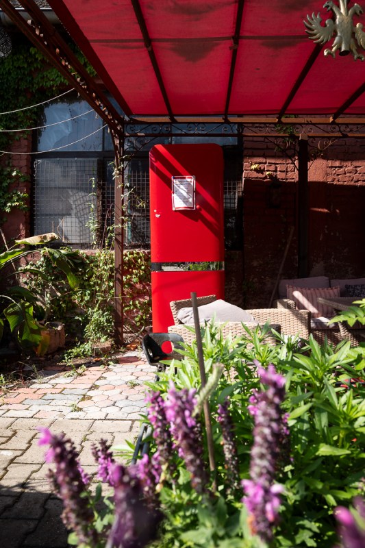 Überhaupt der Hof! Michael Lux hat ihn begrünen lassen. Die roten und schwarzen Johannisbeeren tragen schon Früchte, die kleinen Apfelbäumchen stehen kerzengerade, als wären sie noch ein wenig schüchtern, am Maibaum flattern bunte Kreppbänder. Auch die Gartenstühle sind bunt und der zum Bücherschrank umfunktionierte Kühlschrank karmesinrot.