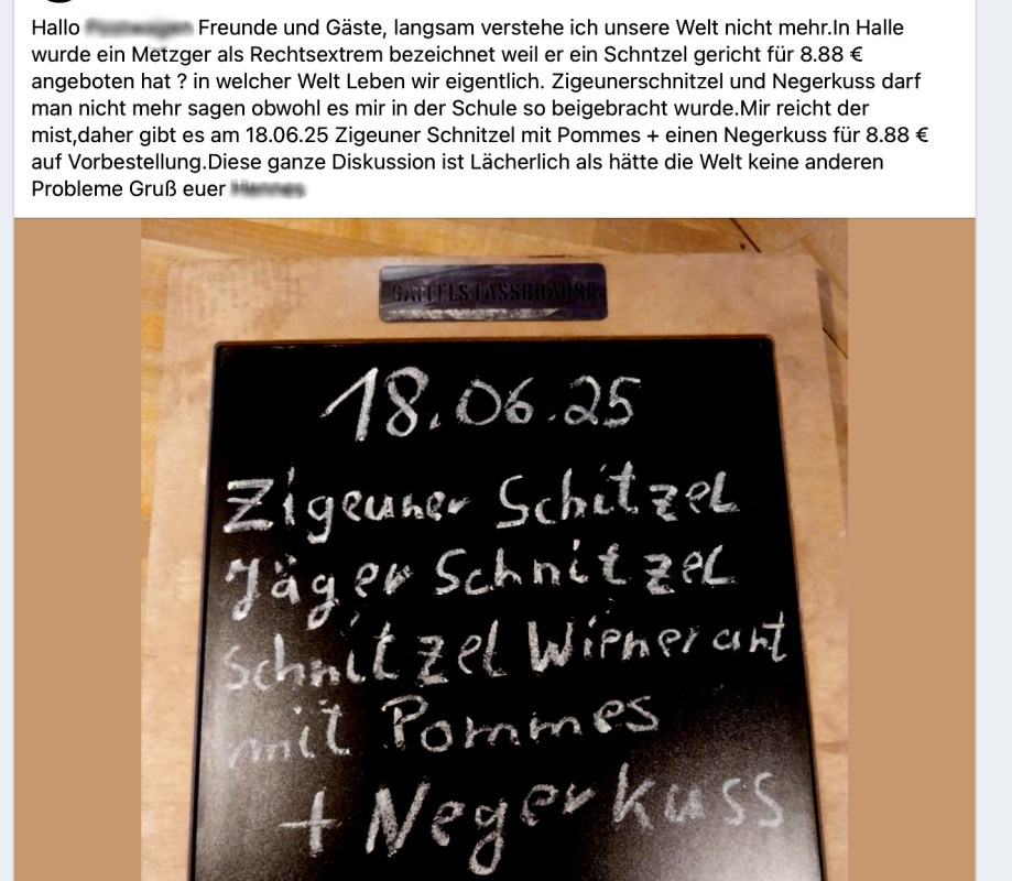 Der Gastwirt hatte sich in unserem Gespräch ausdrücklich auf einen Metzger in Halle bezogen, der “Zigeunerschnitzel” und “Negerküsse” zum Preis von 8,88 € angeboten habe. Erst heute erfuhr ich, dass BILD über den Fall berichtet hatte. Allerdings bot er lediglich “Schnitzel, Spiegelei und Bratkartoffel” für 8,88 € an. Über einen Skandal mit den Bezeichnungen Z…schnitzel und dem N…kuss eines Rügener Lokals berichtete der NDR vor einem knappen Jahr. Dort ging es nur um die Begriffe, aber keinen Preis. Dass es einen weiteren Metzger in Halle geben sollte, der sowohl mit denselben Wörtern als auch dem identischen Preis geworben hat, halte ich für äußerst unwahrscheinlich.