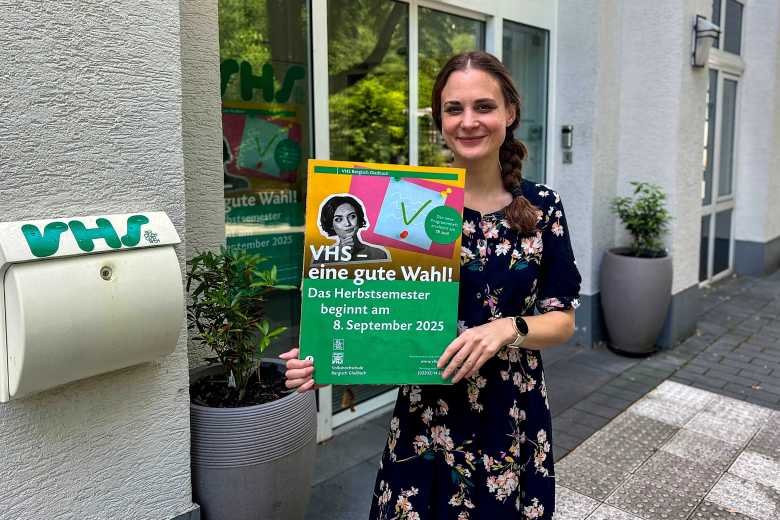 VHS-Leiterin Nicole Mrziglod präsentiert das Plakat zum neuen Programm. Foto: Stadt GL