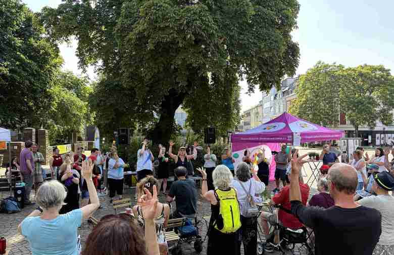 „Mit den Menschen ins Gespräch zu kommen, mit denen ich mich nicht alltäglich unterhalten kann hat mir gut gefallen. Verschiedene Perspektiven an einem Tisch, das war gut“, berichtet eine Teilnehmerin vom offenen Gesprächsangebot. Die ca. 120 Besucherinnen und Besucher genossen ein kleines Rahmenprogramm, bei dem u. a. das inklusive Tanztheaterensemble „Lichtgestalten“ zum Mittanzen einlud.
