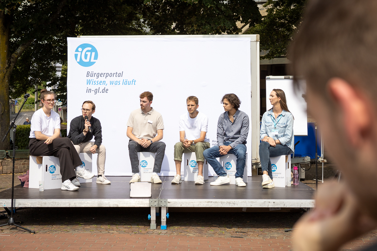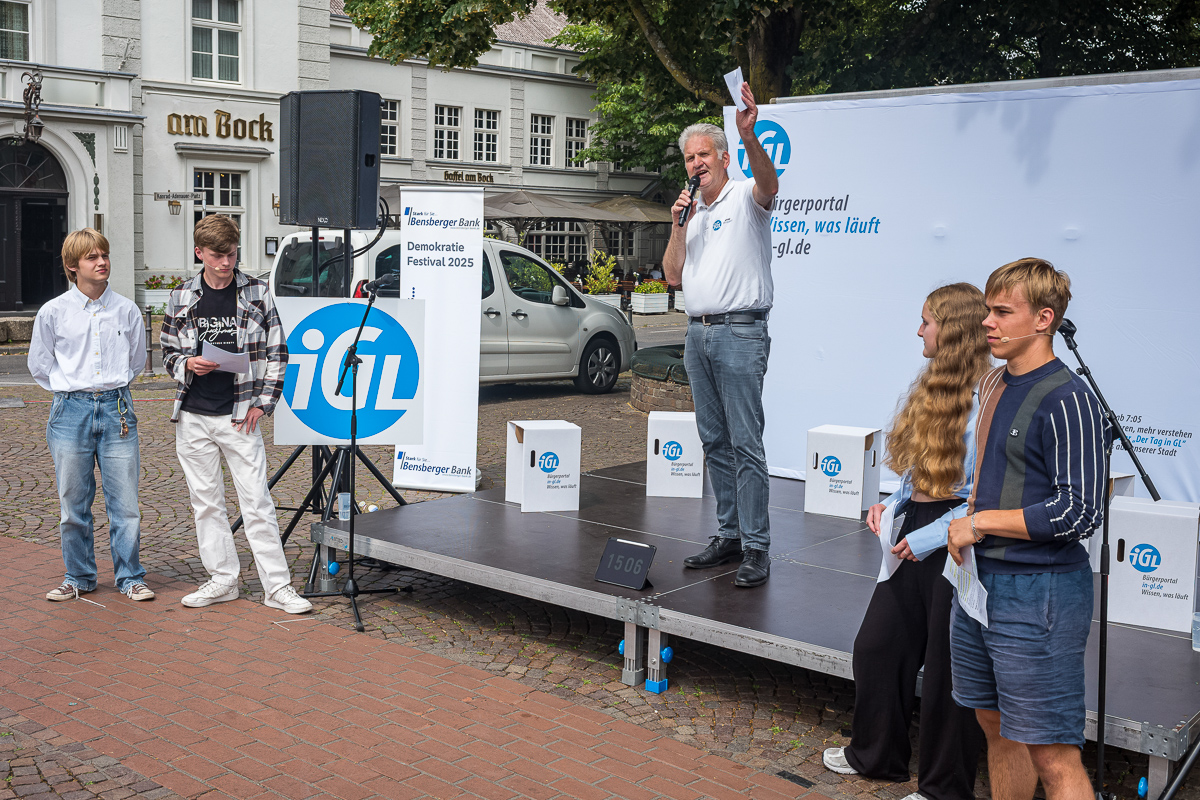 Mut bewiesen auch vier Schüler:innen aus der 11. Jahrgangsstufe des Gymnasiums Herkenrath, die das Festival mit der Jugenddebatte auf der großen Bühne vor der Laurentiuskirche eröffneten: Lars Gronewald, Jasper Küster, Charlotte Wanken und Bastian Zöllner befragten junge Parteimitglieder, die für den Stadtrat kandidieren, warum sie sich in der Lokalpolitik engagieren.