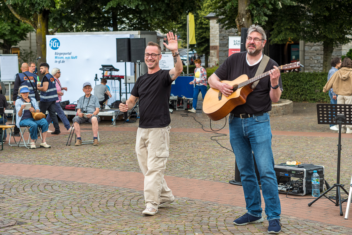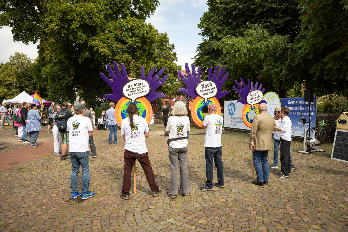 Mit dabei waren diejenigen, die sich in Vereinen und Organisationen für den Erhalt der Demokratie, für den Zusammenhalt der Gesellschaft aktiv engagieren, öffentlich Stellung beziehen. Doch es kamen auch viele, die einfach mal schauen wollten, neugierig waren auf das, was da auf dem Marktplatz unter dem Motto „Gemeinsam für Demokratie in GL“ geboten wurde oder die sich über die Kandidat:innen und die Parteien informieren wollten, die bei der Kommunalwahl antreten.