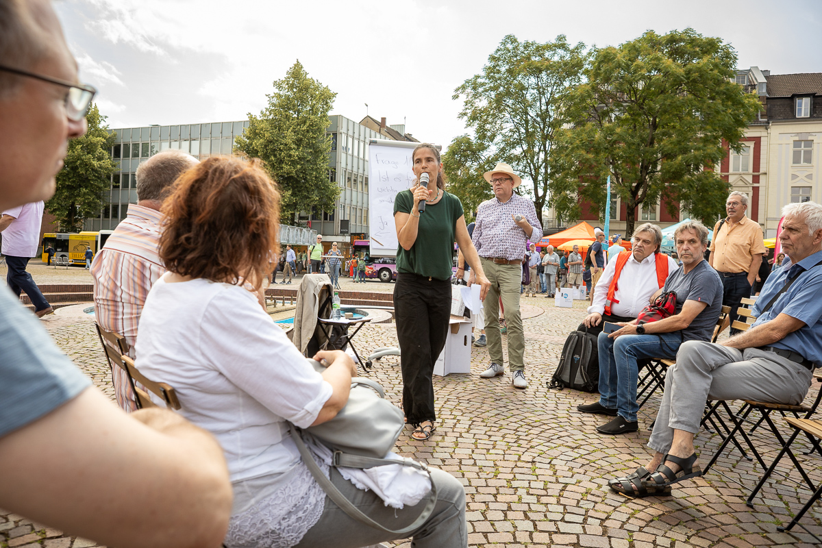 In der Speakers Corner widmeten sich kluge Köpfe der Stadtgesellschaft und Kandidat:innen der Parteien für den Stadtrat und das Amt des Landrats der Frage, wie die lokale Demokratie in Bergisch Gladbach gestärkt werden kann. Nach kurzen Impulsvorträgen gab es Zeit für Fragen, anschließend konnten die Gespräche an Tischen fortgesetzt werden.