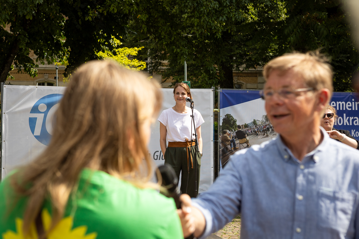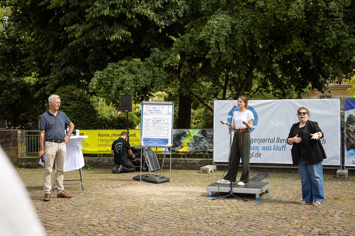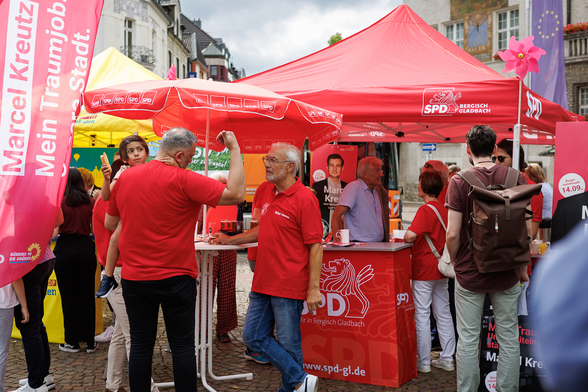 Den ganzen Nachmittag über präsentierten sich neben den lokalen Parteien und den Kandidat:innen für den Stadtrat auch Vereine, Einrichtungen und Initiativen, die sich für die Demokratie in Bergisch Gladbach einsetzen. Beim Stand der Omas gegen Rechts konnten Kinder und Jugendliche Buttons gestalten, die Initiative KlimaGerechtLeben startete eine Umfrage zum Thema Klima und Demokratie, der Verein Bergisch Gladbach für Vielfalt und Demokratie veranstaltete ein Demokratie-Quiz.