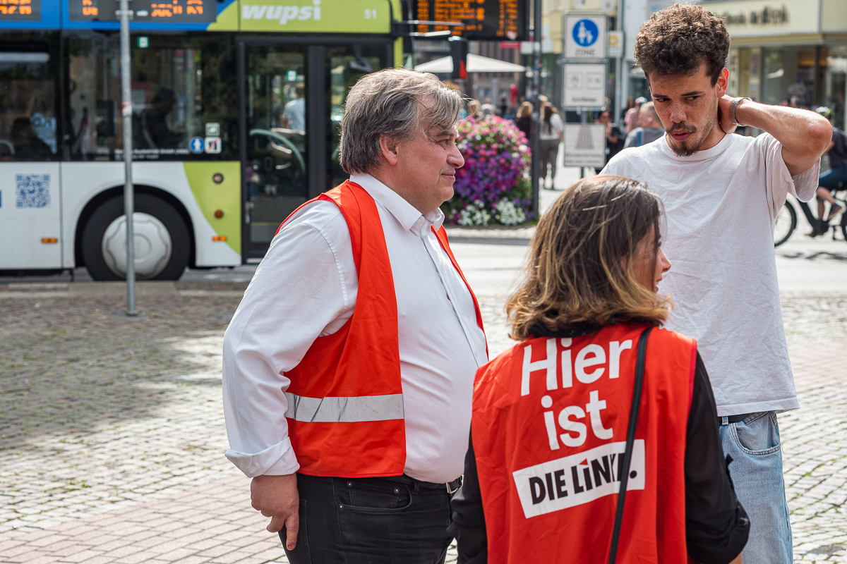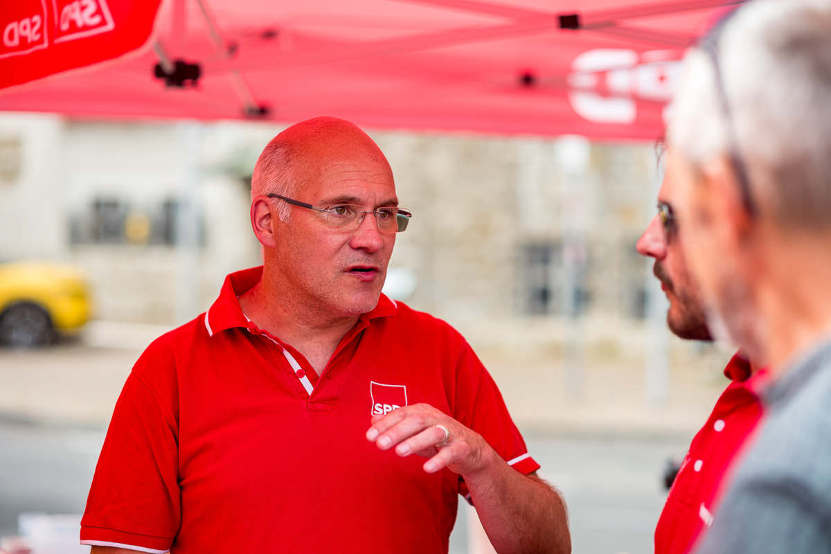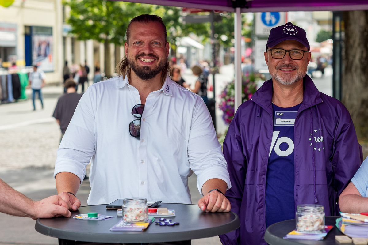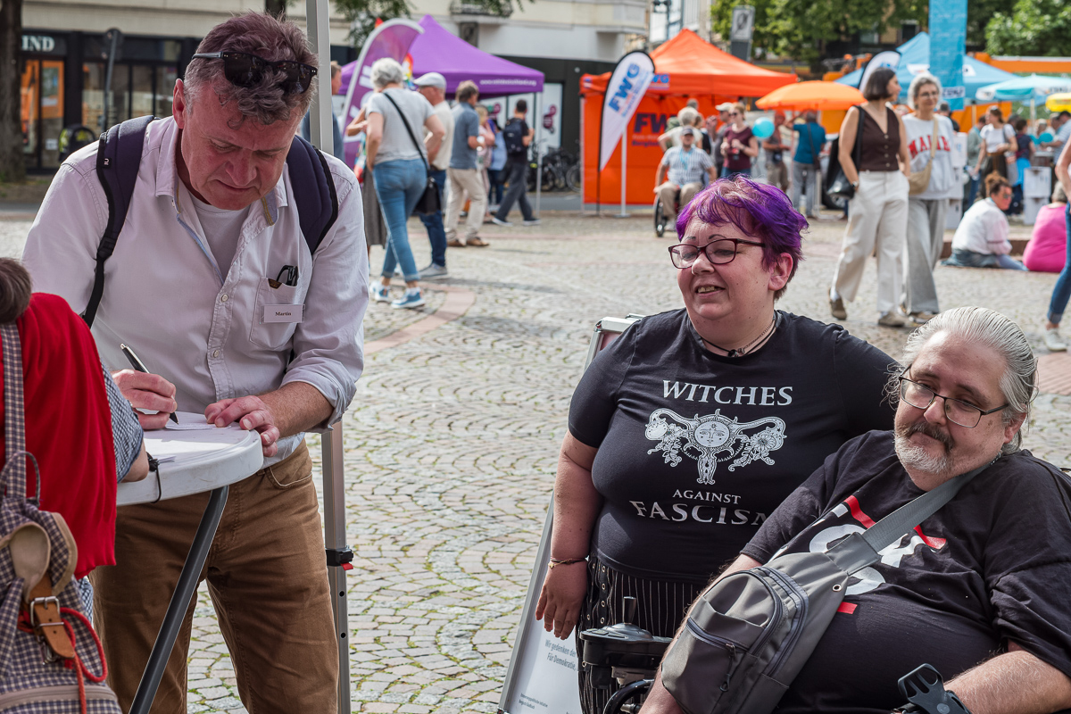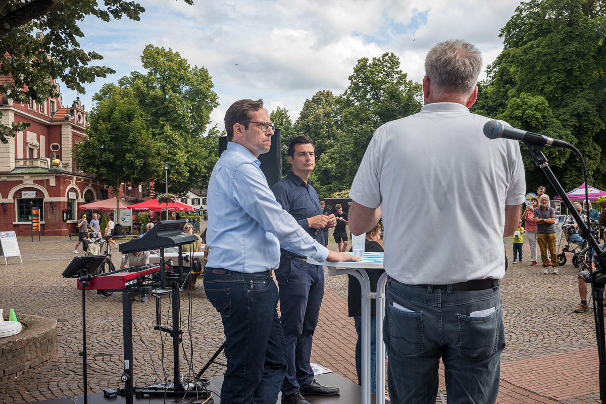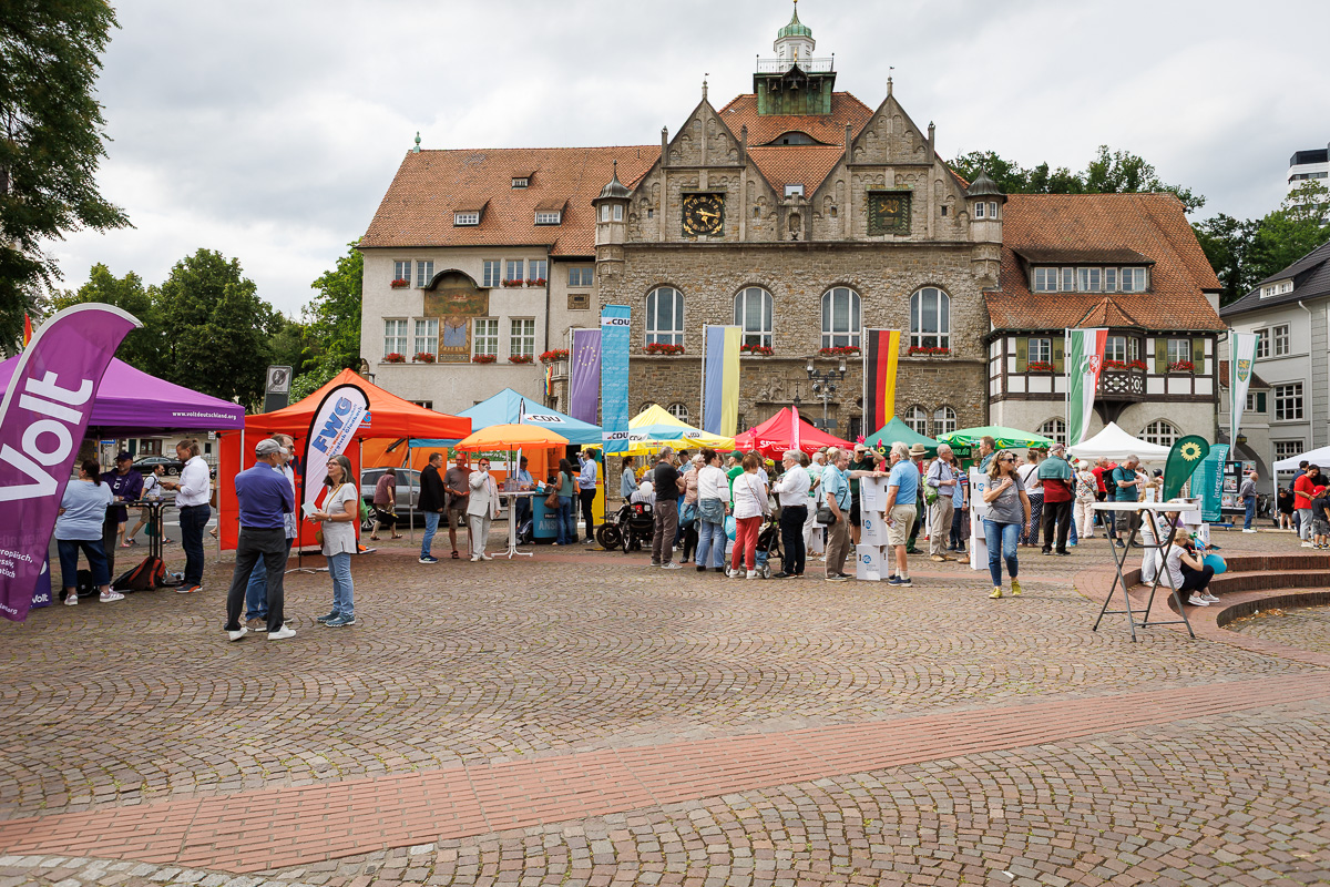 Die demokratischen Parteien der Stadt präsentierten ihre Kandidat:innen und ihre Inhalte für die anstehende Wahl mit eigenen Ständen am Rand des Marktplatzes. Viele der Bewerber:innen aus den 27 Wahlkreisen hielten sich beim Kandidaten-Check für Gespräche bereit. Allerdings waren hier offenbar mehr potenzielle Stadtrats-Mitglieder anwesend als potenzielle Wählerinnen und Wähler, was viele für einen parteiübergreifenden Austausch nutzten.