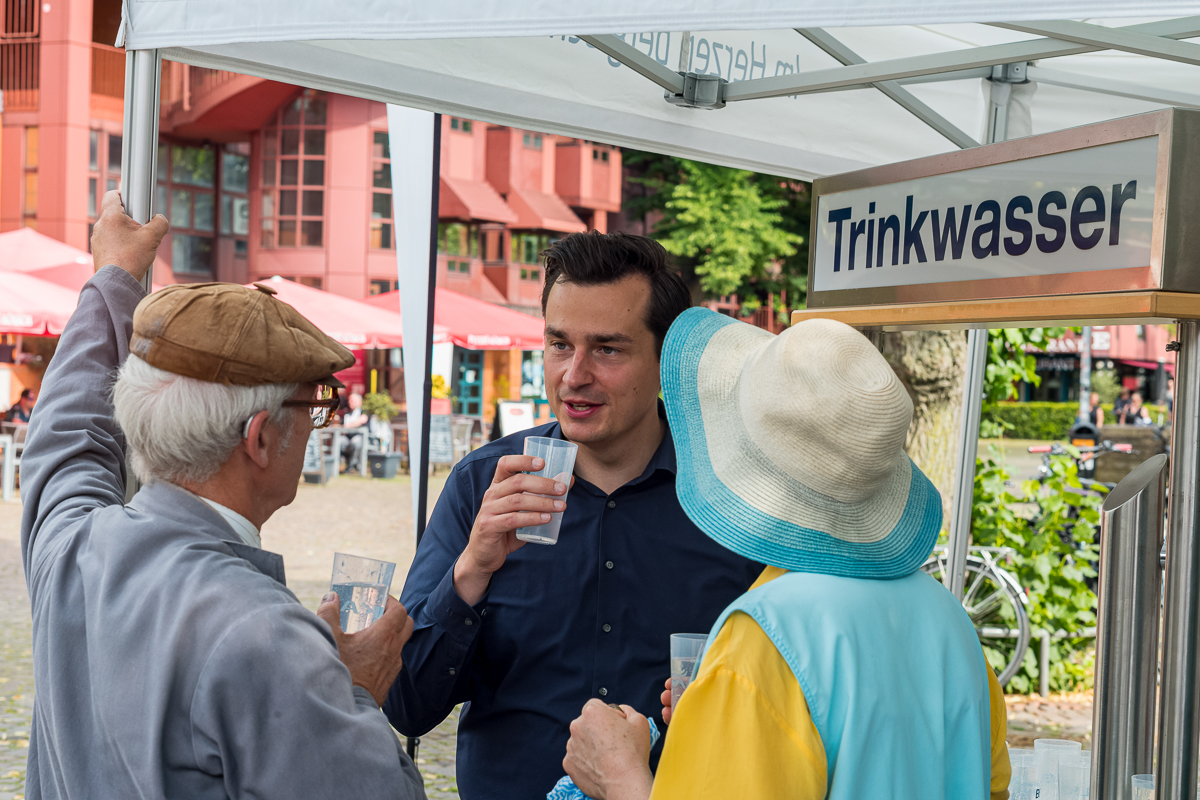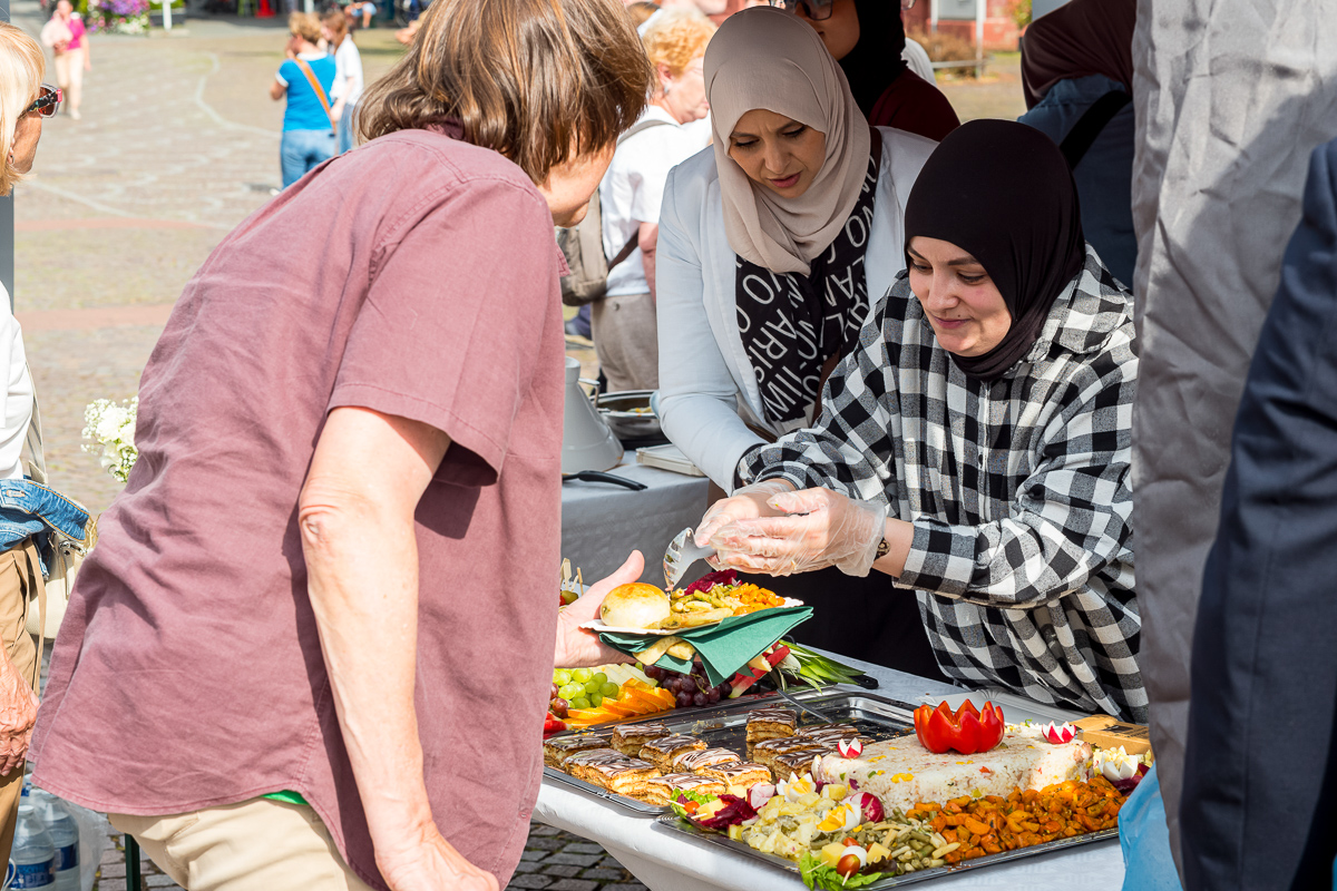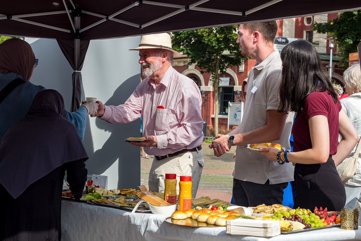 Einige Migrantenvereine und der Islamische Gemeinde e.V. aus Heidkamp boten ein internationales Buffet mit vielen Köstlichkeiten an, die Belkaw versorgte an einer Wasser-Bar die Besucher:innen mit frischem Trinkwasser.