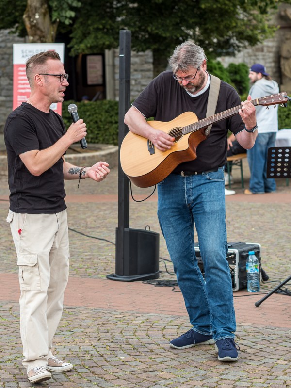 Einzig, als das Duo Pascal „Unsere Stammbaum“ anstimmten – die musikalische Hymne der Bläck Fööss zum Thema Vielfalt und Zusammenhalt – und viele auf dem Markt mitsangen, schunkelten die beiden „Störenfriede“ mit. Später veriet Georg Watzlawek, dass es sich bei ihnen um Udo Passon und Claudia Timpner vom Theas Theater handelte.