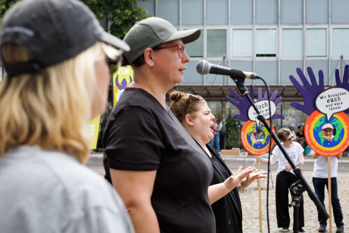 Die inklusive Tanzgruppe „Lichtgestalten“ machte zusammen mit der Servicestelle InBeCo mit einer Protestwand und einer Fotoaktion auf Probleme (und Angebote) aufmerksam. „Anna soll überall mitmachen“, „Schule für alle“ oder „Inklusion ist ein Menschenrecht“ war auf neonfarbenen Zetteln zu lesen. Die „Lichtgestalten“ begeisterten außerdem auf der großen Bühne mit einem Gebärdentanz, bei dem am Ende viele Zuschauer:innen mittanzten.
