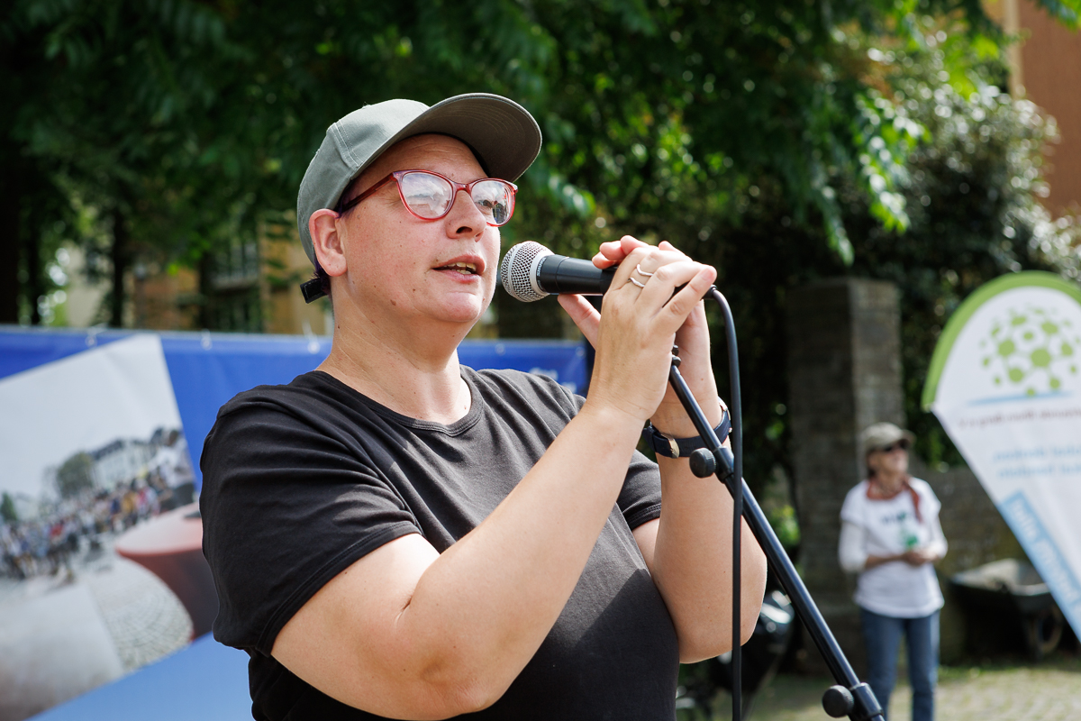 „Ich könnte meine 180 Sekunden dafür verwenden, für die Volkshochschule zu werben“, eröffnete VHS-Leiterin Nicole Mrziglod die Speakers Corner. „Doch ich möchte sie lieber für einen Appell nutzen: Demokratie beginnt bei uns allen.“ Es liege an uns, eine offene Haltung einzunehmen. Mrziglod forderte ihre Zuhörer:innen dazu auf, andere Menschen anzulächeln. Das trage zu einer veränderten Haltung und am Ende zur Demokratie bei.