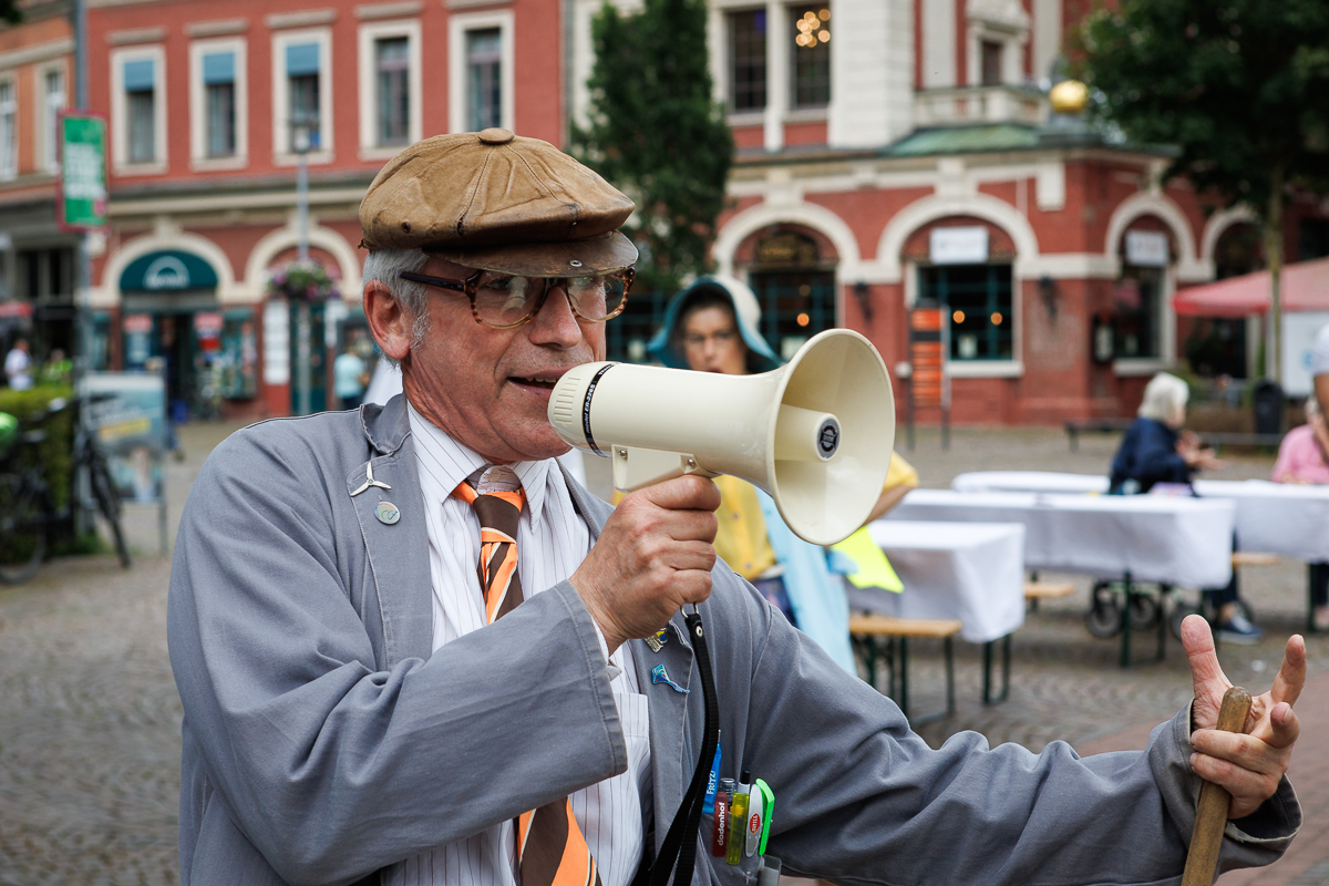 Für Unterhaltung, aber auch für (gewollte) Irritation sorgten ein überaus eifriger Hausmeister und eine Putzkraft für „Platzhygiene“, die mit Megafon und Staubwedel über den Marktplatz fegten, sich von Bürgerportal-Chefredakteur Georg Watzlawek die Genehmigung für die Veranstaltung zeigen ließen, viel zu meckern und aufzuräumen hatten.