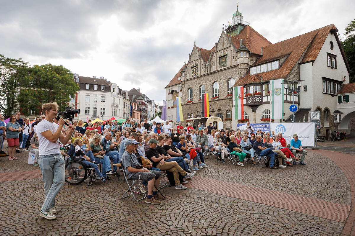 Wie vielfältig die lokale Demokratie ist, hat das Festival zur Kommunalwahl auf dem Marktplatz eindrucksvoll unter Beweis gestellt. Vereine, Organisationen und viele weitere Akteure trugen gemeinsam mit dem Bürgerportal zu einem Programm mit Debatten und Dialogen, Theater und Musik, Essen und guter Stimmung bei. Hunderte Menschen kamen, um sich zu informieren, zu debattieren und zu engagieren.