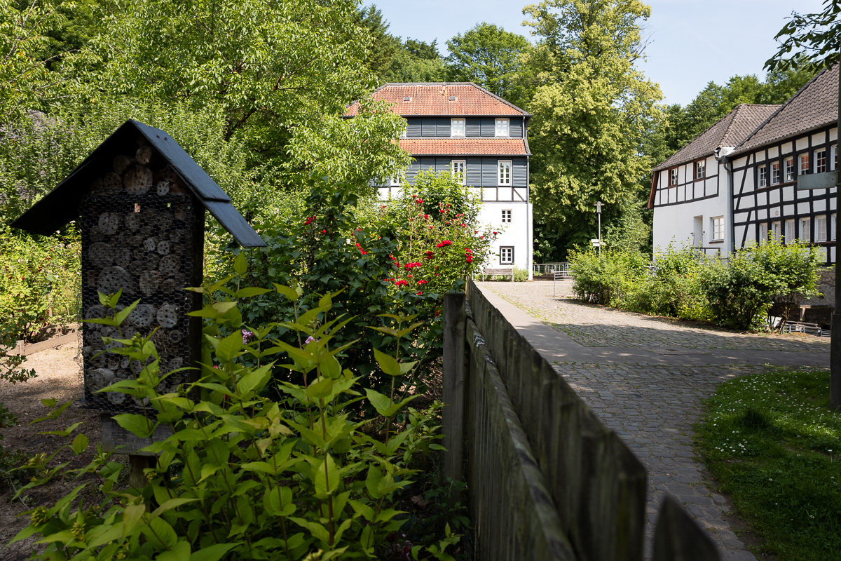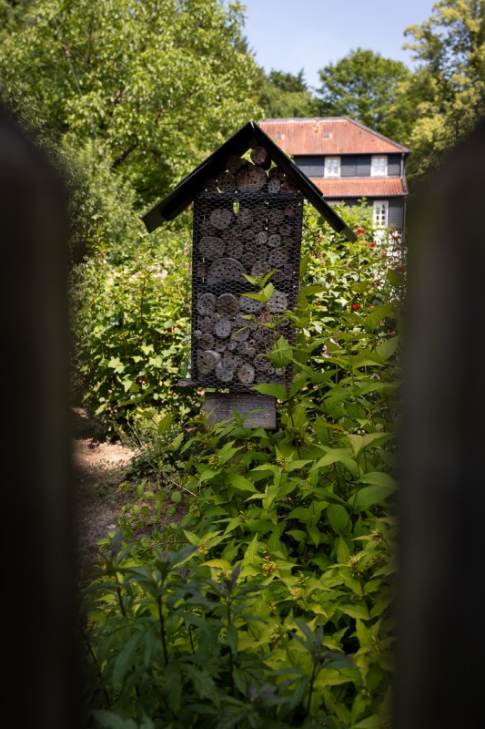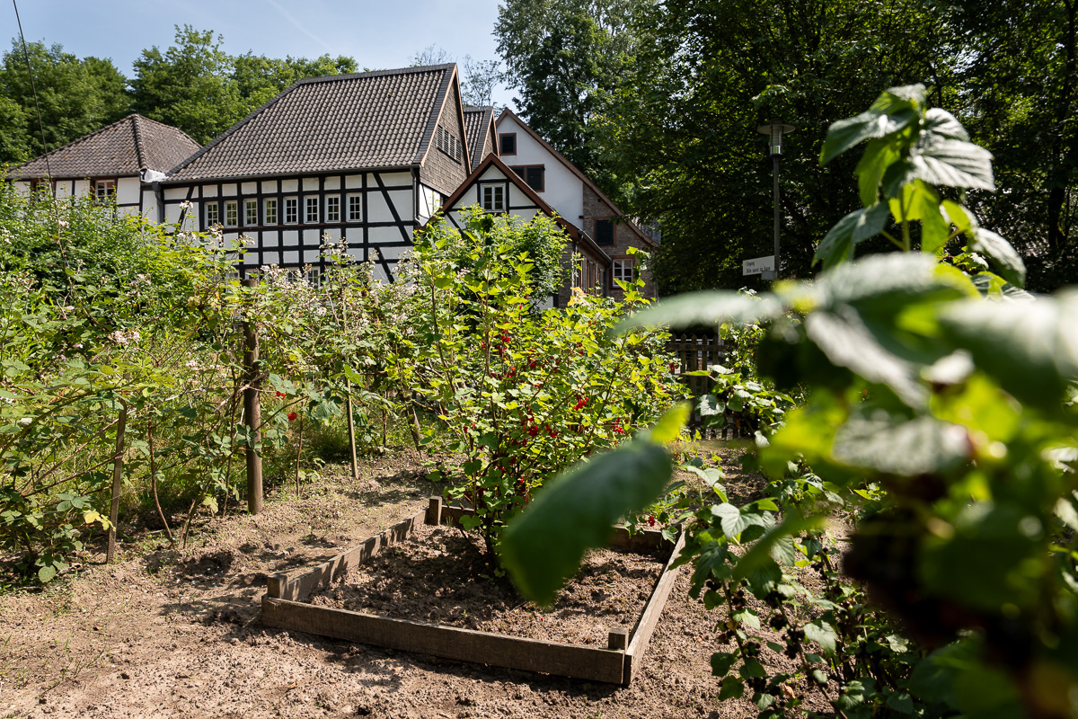 Alles, was das Gärtnerherz begehrt, ist in der kleinen Gartenanlage des LVR Industriemuseums Alte Dombach in Herrenstrunden zu finden: ein Insektenhotel, Hochbeete, Ackerflächen, ein Gewächshaus, Obstgehölze, ein Komposthaufen, Zierbeete und besonders viele Nutzbeete.