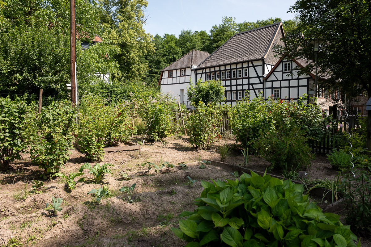 Auch ein Bauerngarten gehört zum LVR Industriemuseum Alte Dombach – und macht deutlich, wie wichtig die Nutzgärten für die Familien der Papiermacher früher waren. Heute wird der Garten von drei Ehrenamtler:innen bewirtschaftet, die die Tradition wach halten und sich selbst einen paradiesischen Ort der Stille und Demut geschaffen haben.