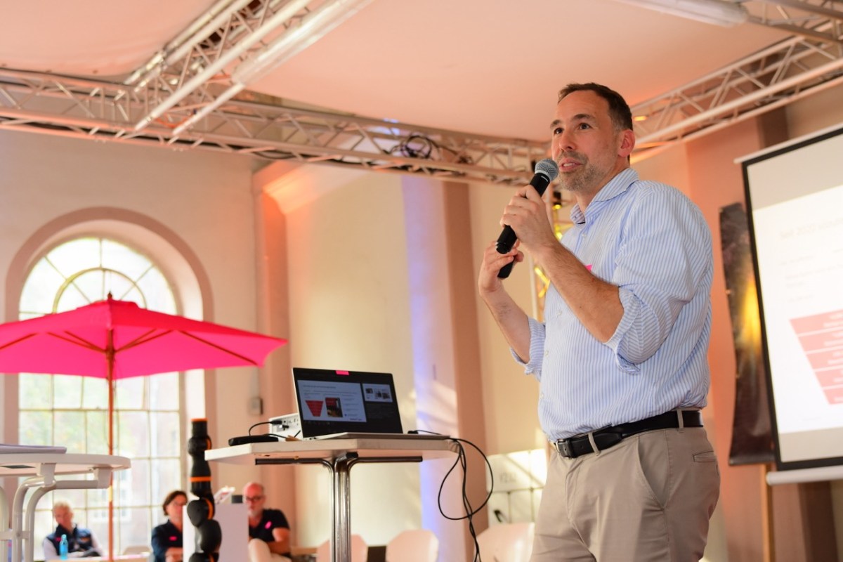 Frank Blase, CEO der igus GmbH & Gründer, beginnt seinen Impulsvortrag wort- aber nicht tonlos. Als Auftakt spielt er auf einem Kazoo die Melodie des Bergischen Heimatlieds. „Erste Regel: anders sein“, sagt er danach. Mit über einer Milliarde Umsatz hat sein Unternehmen den Start-up-Status schon lange verlassen.