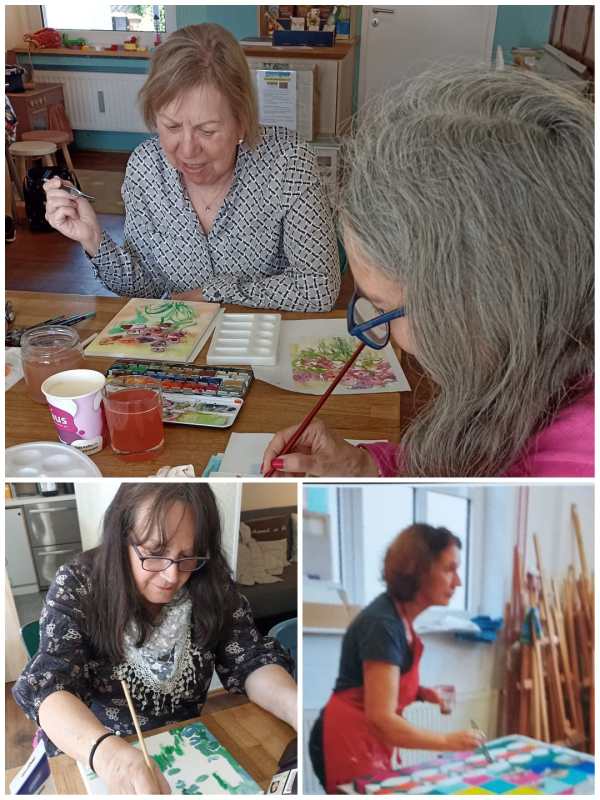 Man kommt zur Ruhe, fühlt sich in angenehmer Atmosphäre entspannt und freut sich am Ende der Malstunde, etwas geschaffen zu haben, das man in den Händen halten und mit nach Hause nehmen kann. So entstehen Bilder mit verschiedenen Inhalten, unterschiedlichen Techniken und einer großen Farbenvielfalt.
