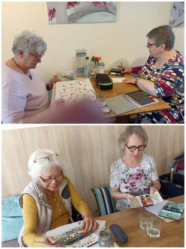 Die Fortgeschrittenen, die schon länger dabei sind, unterstützen sich gegenseitig und geben Ratschläge und Tipps. Gemalt wird hauptsächlich mit Aquarellfarben, aber auch mit Acrylfarben und Stiften.