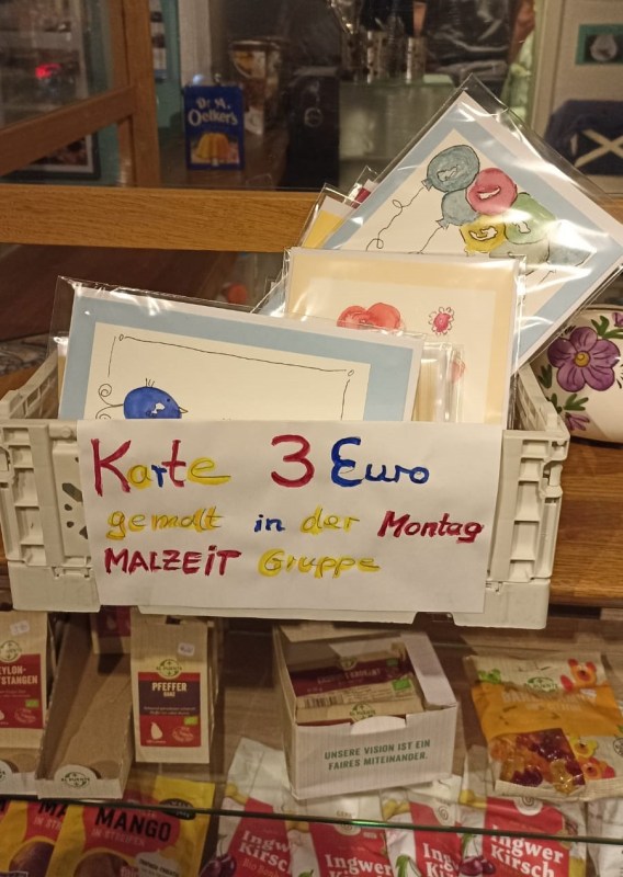 Oft werden auch kleine Kunstwerke in Postkartenformat geschaffen, die im Himmel un Ääd-Café gegen Spende zu erwerben sind. Diese schönen Grußkarten finden guten Absatz und die Spenden unterstützen die Arbeit von Himmel un Ääd und die jeweiligen Sozialprojekte. Dass der Erlös der Karten so einem „guten Zweck“ zugutekommt, freut sowohl die Maler:innen, wie auch die Menschen, die die schönen Karten erwerben.