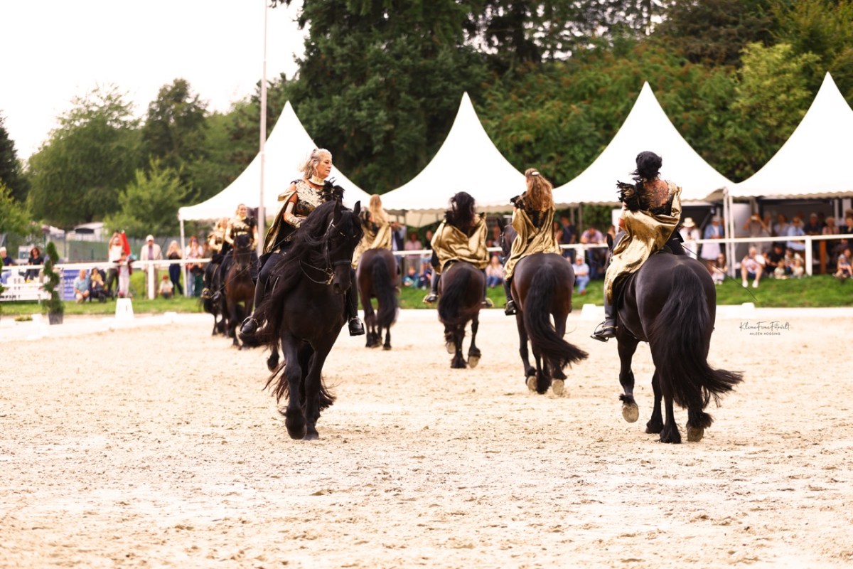 Riesen Applaus gab es für Emilia Schlotterbeck und ihre „Dancing Horses“, die sie mit einer Freiheitsdressur ganz ohne Sattel präsentierte. Harmonie in der Bewegung lieferten auch die sechs stolzen Friesen, vorgestellt mit einer Quadrille von der Reitergruppe Black Motions aus Dormagen.