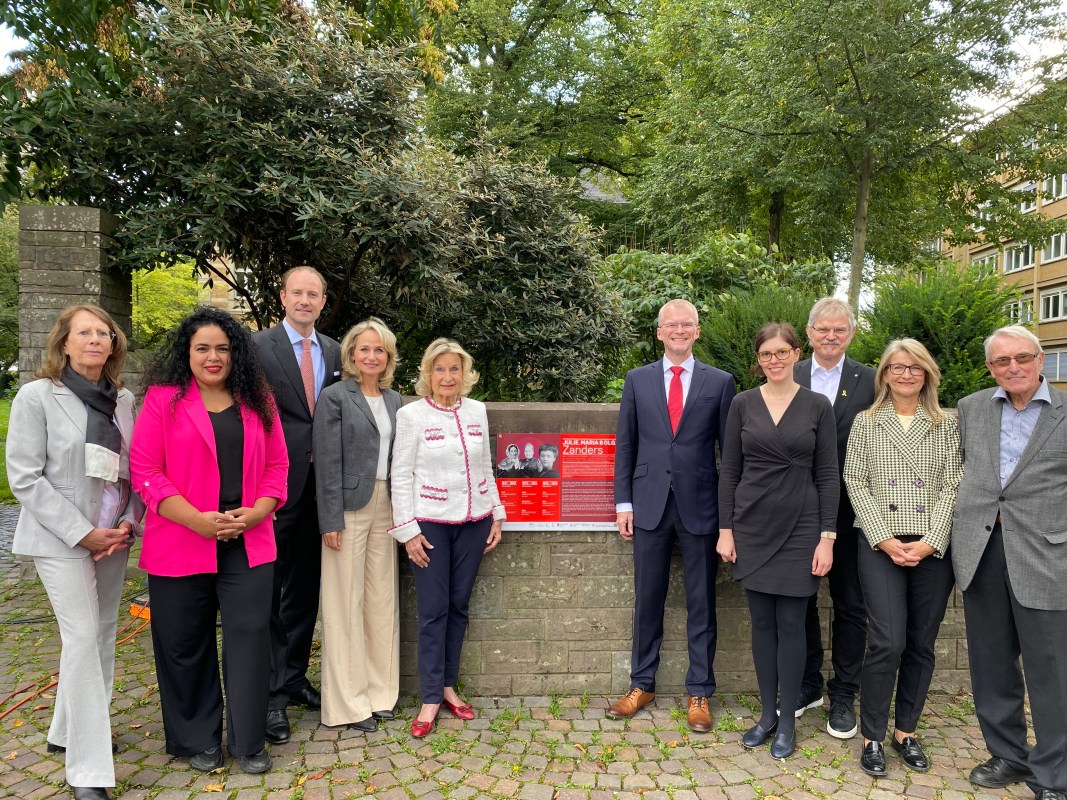 In großer Runde wurde die Tafel des FrauenOrtes für die drei Zanders-Frauen Julie, Maria und Olga eingeweiht. Foto: Stadt GL