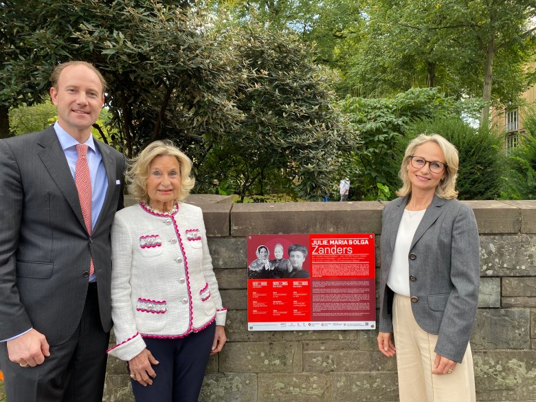 Hans Christian Zanders, Silvia Zanders und Tatjana Gräfin von Spee vor der Tafel, die an ihre Vorfahrinnen erinnert. Foto: Stadt GL