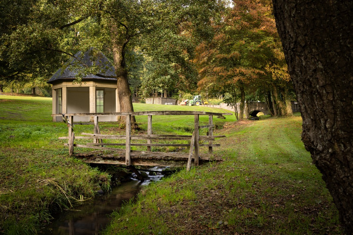 Die kleine Holzbrücke über den Lerbach gegenüber des Teepavillons ist abgesperrt, einige Bretter fehlen. Der Lerbach plätschert munter wie vor 100 Jahren und im Teich spiegeln sich die Südterrasse des Herrenhauses und Gehölze.