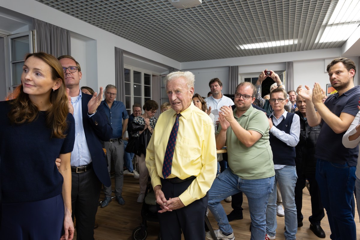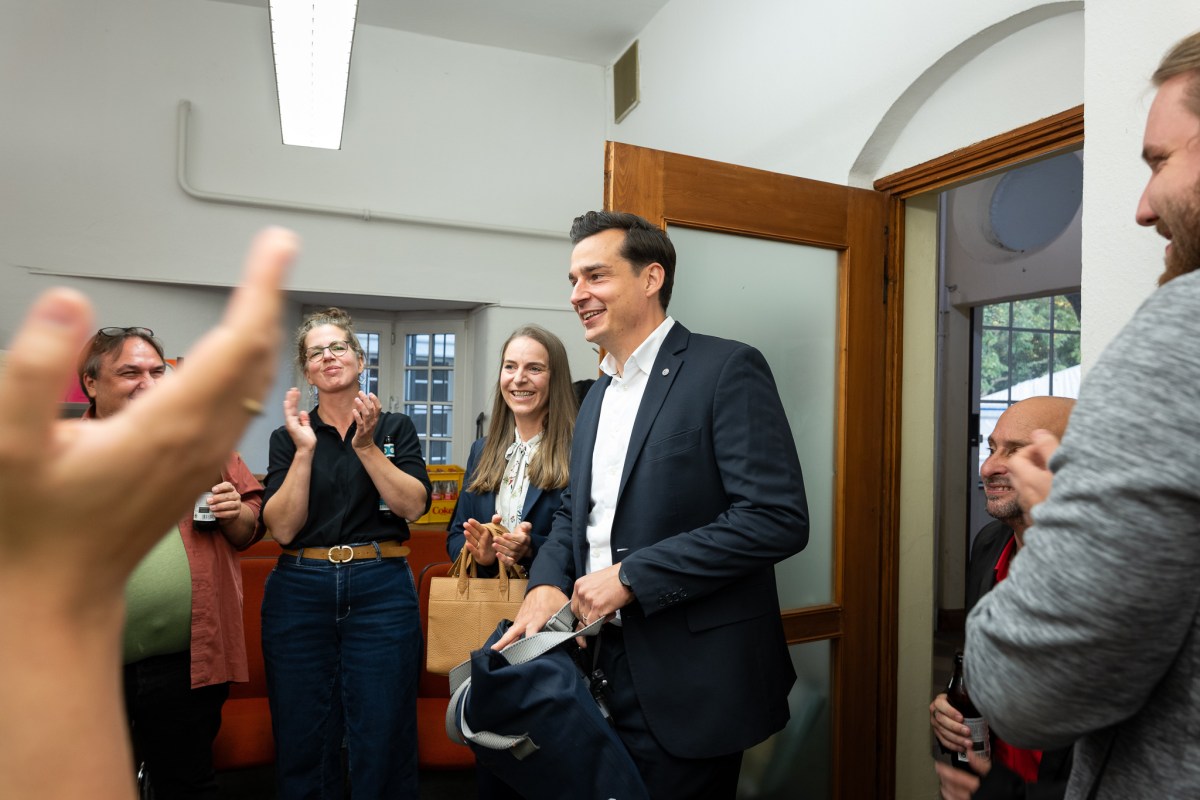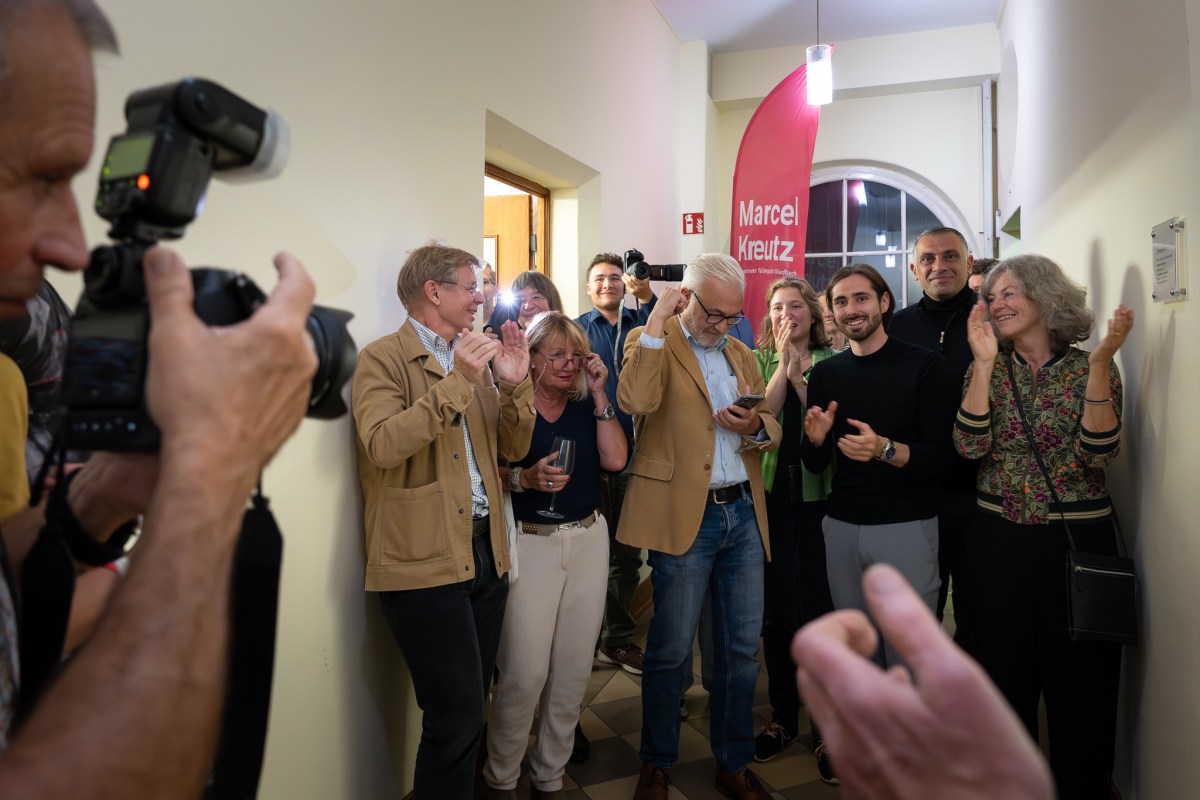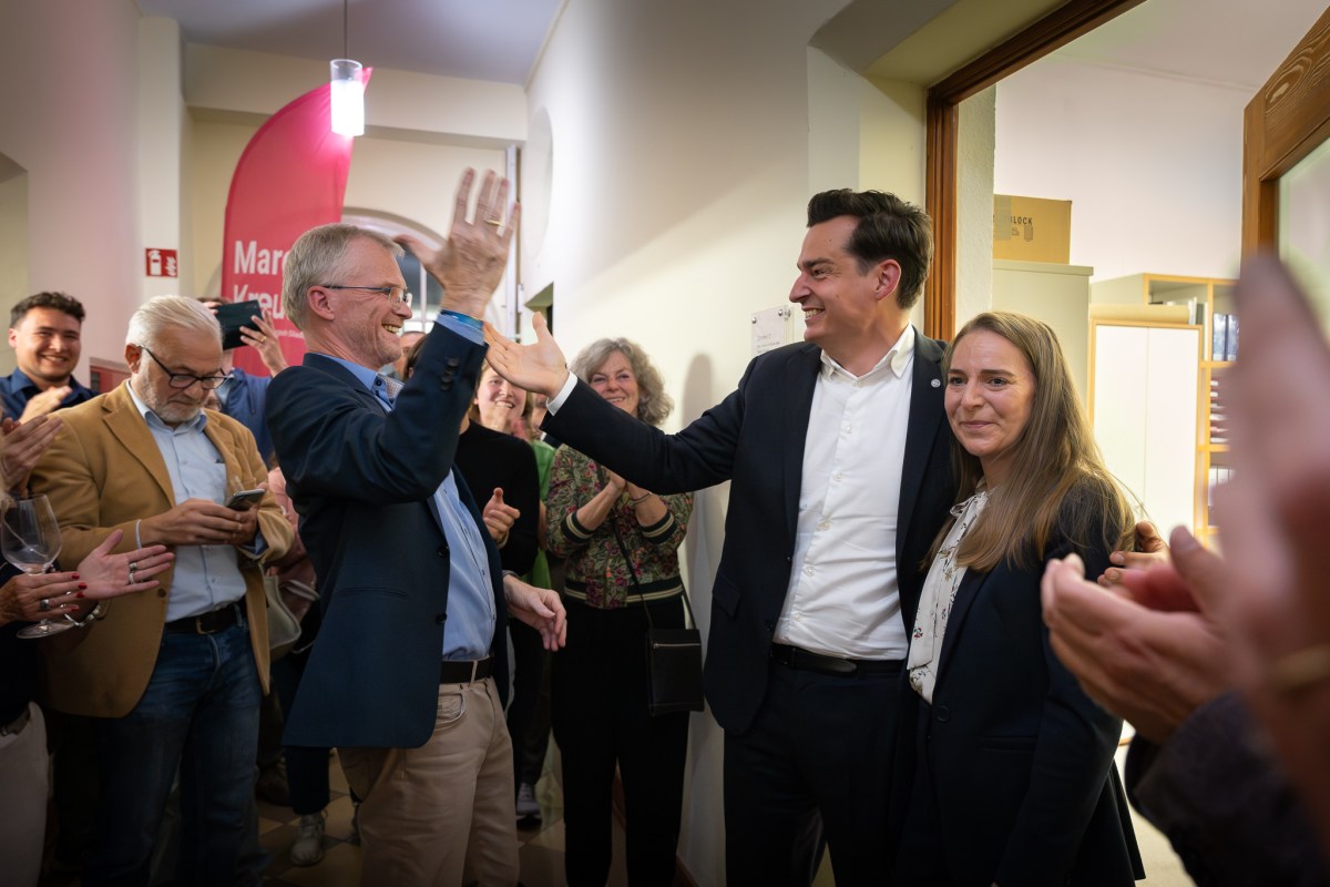 Marcel Kreutz wird begeistert bei seinen Anhänger:innen begrüßt, aber noch dauert die Auszählung an, der Vorsprung schmilzt ab.