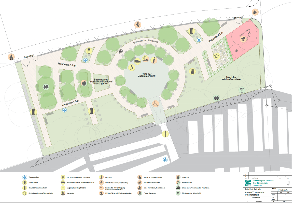 „Unter dem Arbeitstitel ,Eingang Nord‘ erhält der Friedhof Refrath eine erforderliche Wegeanbindung in Richtung der Straßen ,Siebenmorgen‘ und ,An der Wallburg‘. Für ältere Bürger ist diese Zuwegung interessant, da die Haltestelle des öffentlichen Personenverkehrs Refrath Siebenmorgen (Buslinien 451 und 452) in unmittelbarer Nähe liegen.“