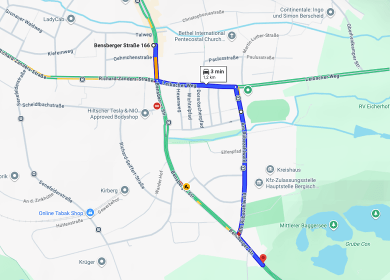 Man kann auch anstatt links auf den Lerbacher Weg (und sich dann ewig an die Ampel anzustellen) rechts auf den Lerbacher Weg fahren und dann links in die Oberheidkamper Straße fahren. Über diese Verbindung kann man rasch zum EVK und Odenthaler Straße fahren.