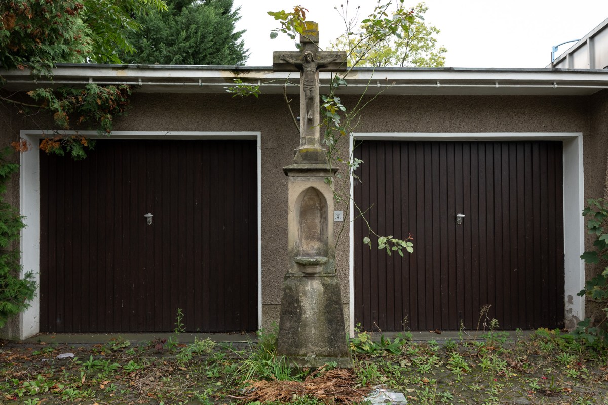 Auf den ruhenden Verkehr auf Parkplätzen und in Parkhäusern wurde oben schon hingewiesen. Zum Schluss sei der ruhenden Autos in Garagen gedacht – hier mit christlichem Beistand in Form eines Bilderstöckchens zwischen zwei Garagen unweit der FHDW am Gronauer Mühlenweg.
