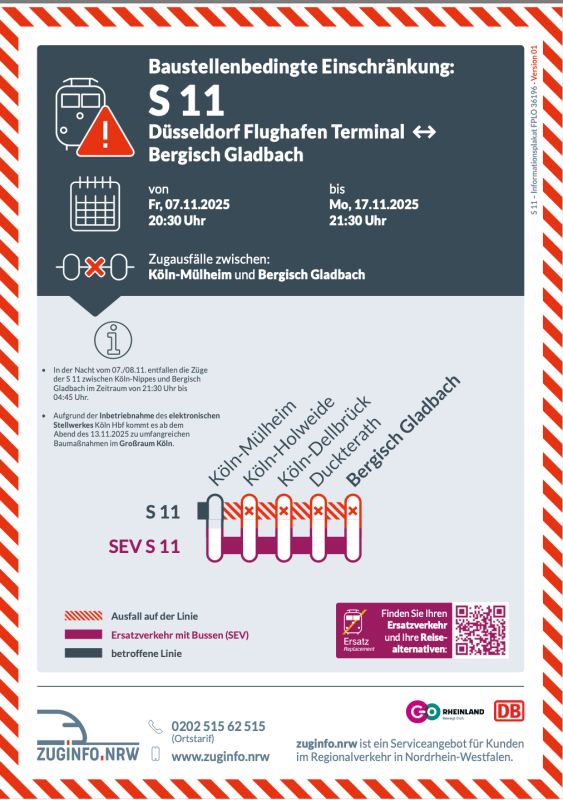 Die Linie 1 ab Bensberg, Neuenweg oder Refrath als Alternative zur S 11 zu betrachten ist ein Witz. Zu Zeiten des Berufsverkehrs an Werktagen mit hohem Takt ist sie akzeptabel. Nicht aber ansonsten. Speziell zwischen Merheim und Neumarkt ist sie völlig überfüllt und aufgrund von Randerscheinungen (z.B. aggressiver Bettelei) kaum zumutbar. Deshalb nutze ich gerne des Bus SB 40, der aber an Samstagen nur im Stundentakt fährt, ab Breslauer Platz/Hbf nur bis 19:53 Uhr, und deshalb oft überfüllt ist. Am Sonntag und an Feiertagen fährt er leider überhaupt nicht. Verbesserungen sind m.E., auch wegen Ausfalls der S 11, notwendig.