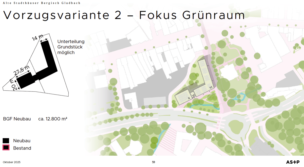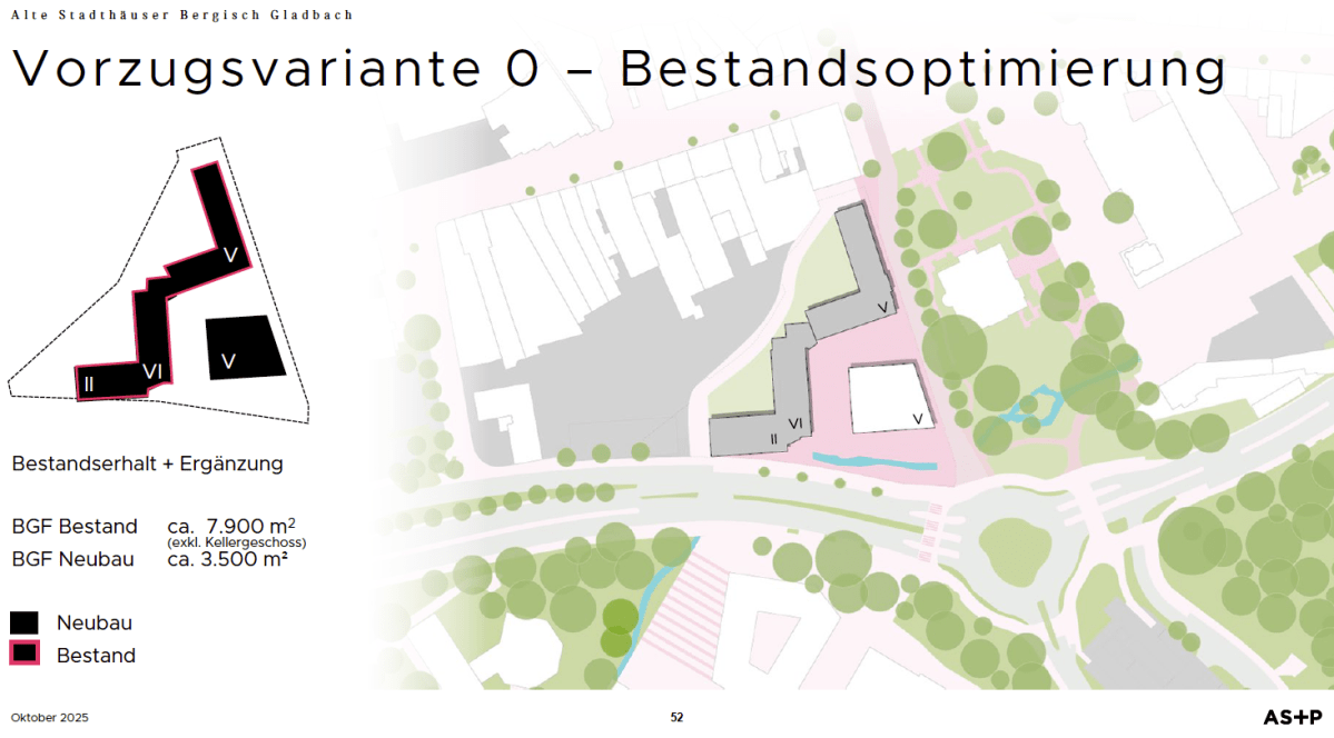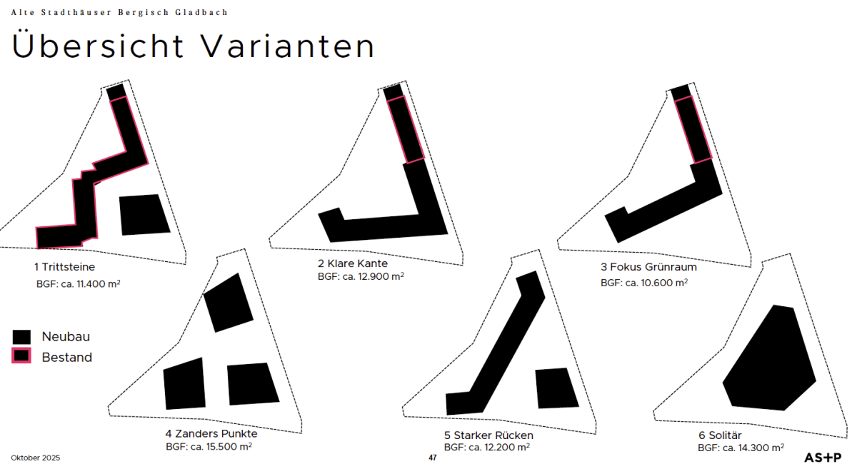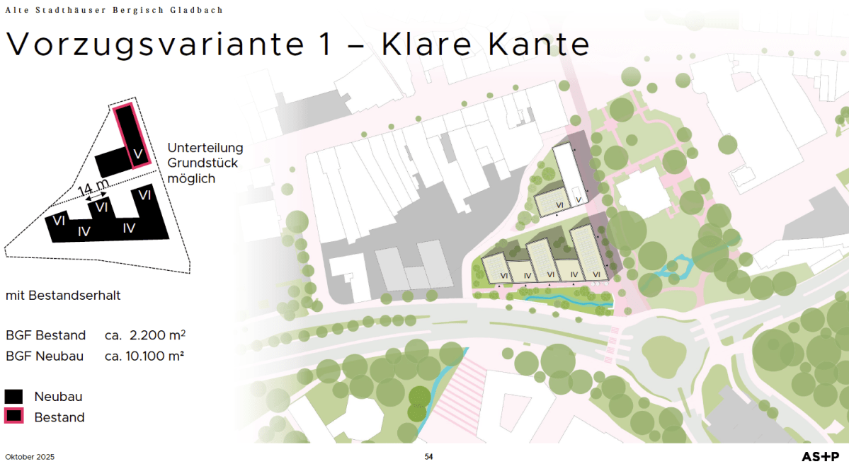 Das Projekt hat eine zentrale städtebauliche Bedeutung und wird das Stadtbild langfristig prägen. Auch wenn die jetzige Gebäudestruktur der alten Stadthäuser gestalterisch nicht unumstritten ist, handelt es sich um ein historisches Ensemble, das vielen Bürgerinnen und Bürgern vertraut ist. Angesichts der geplanten Entwicklung der angrenzenden Flächen und des gegenüberliegenden Zanders-Areals und der hohen stadtplanerischen Relevanz sollten Aspekte wie Klimaschutz, Grünraum, nachhaltige Bauweise und sehr wichtig bezahlbarer Wohnraum hervorgehoben beachtet werden.