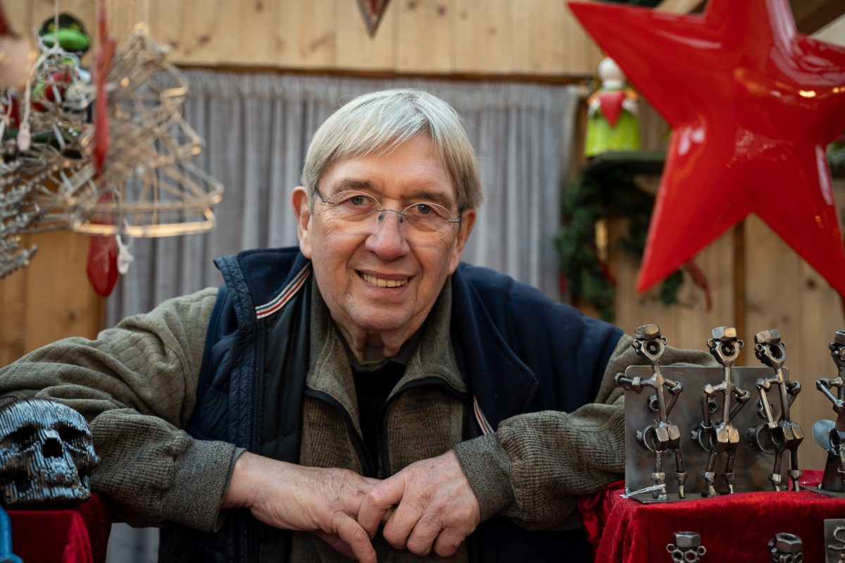 „Ich bin der Metallfritze“, stellt sich Schlößer einem Mann vor. Er plaudert gut gelaunt mit seinen Kund:innen, fragt nach deren individuellen Wünschen, berät bei der Suche nach dem passenden Weihnachtsgeschenk.