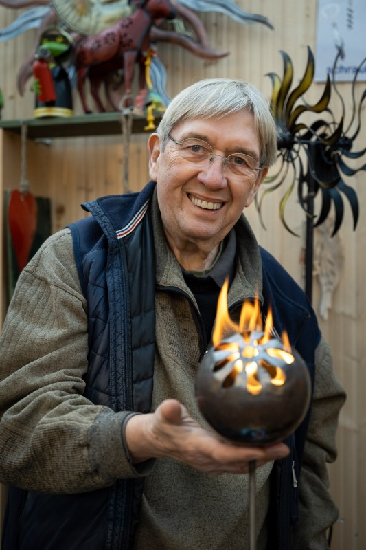 Im Sortiment hat Schlößer auch Windspiele, Gartenstecker und Feuerkugeln, die mit Ethanol oder Brennpaste brennen. „Hier geht es einfach entspannter als in Köln zu. Da ist es mir zu voll und zu hektisch“, sagt eine Frau, die in aller Ruhe die Metallobjekte betrachtet.