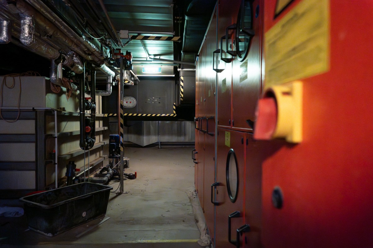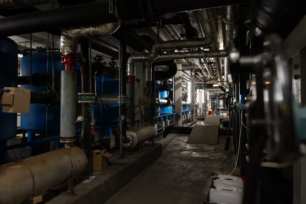 Im Keller erstreckt sich ein weitverzweigtes Netz von Gängen und Rohren. Etwas verloren stapfen wir Jennifer Oestreich hinterher, vorbei an Paletten, auf denen sich Kanister mit Chemikalien stapeln, einem Kriechkeller und allerlei Anlagen. Es zischt und rauscht, an einigen Stellen haben sich Pfützen gebildet.
