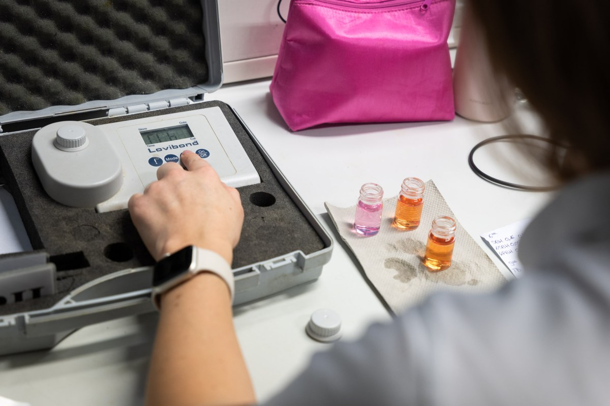 Oestreichs Kollegin mischt sogenannte Indikator-Chemikalien zu den Wasserproben. Sie verfärben sich pink (Chlor) und orange (ph-Wert). Ein digitales Messgerät spuckt die aktuellen Werte aus, die Kollegin schreibt sie auf einen Zettel und gibt sie ihrer Chefin.