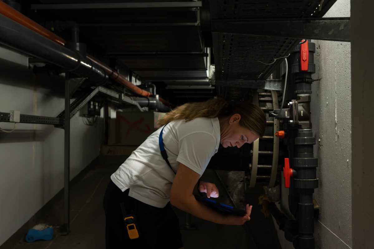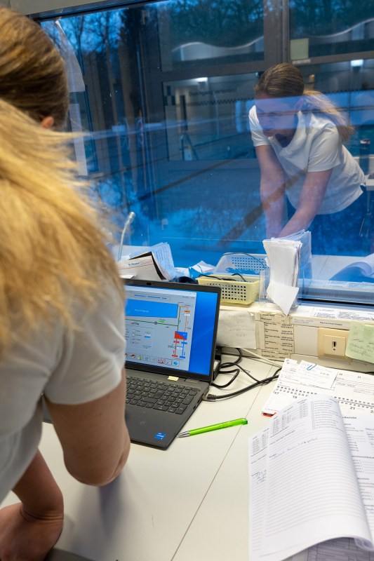 Im Laufe ihrer Schicht überprüft Oestreich noch mehrfach die Chlorwerte, macht ihren Keller-Rundgang, weist den Azubis weitere Aufgaben zu. Laub in den Außenanlagen entfernen, Sauna-Aufgüsse durchführen, Schwimmtraining absolvieren. Immer mal wieder taucht eine Frage oder ein Problem auf.