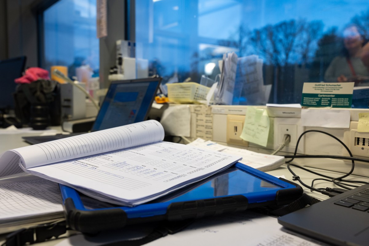 In der verglasten Schwimmmeisterloge trägt Oestreich alle Daten und Werte konzentriert in ein Programm am PC ein. Dokumentation und administrative Aufgaben machen einen großen Teil ihrer Arbeit aus. Schichtpläne schreiben (auch für die anderen Bäder Milchborntal, Hans-Zanders-Bad und das Mohnwegbad), Bestände kontrollieren – etwa von Verbänden und Pflastern, Chemikalien oder Aufgussdüften – und gegebenenfalls nachbestellen.